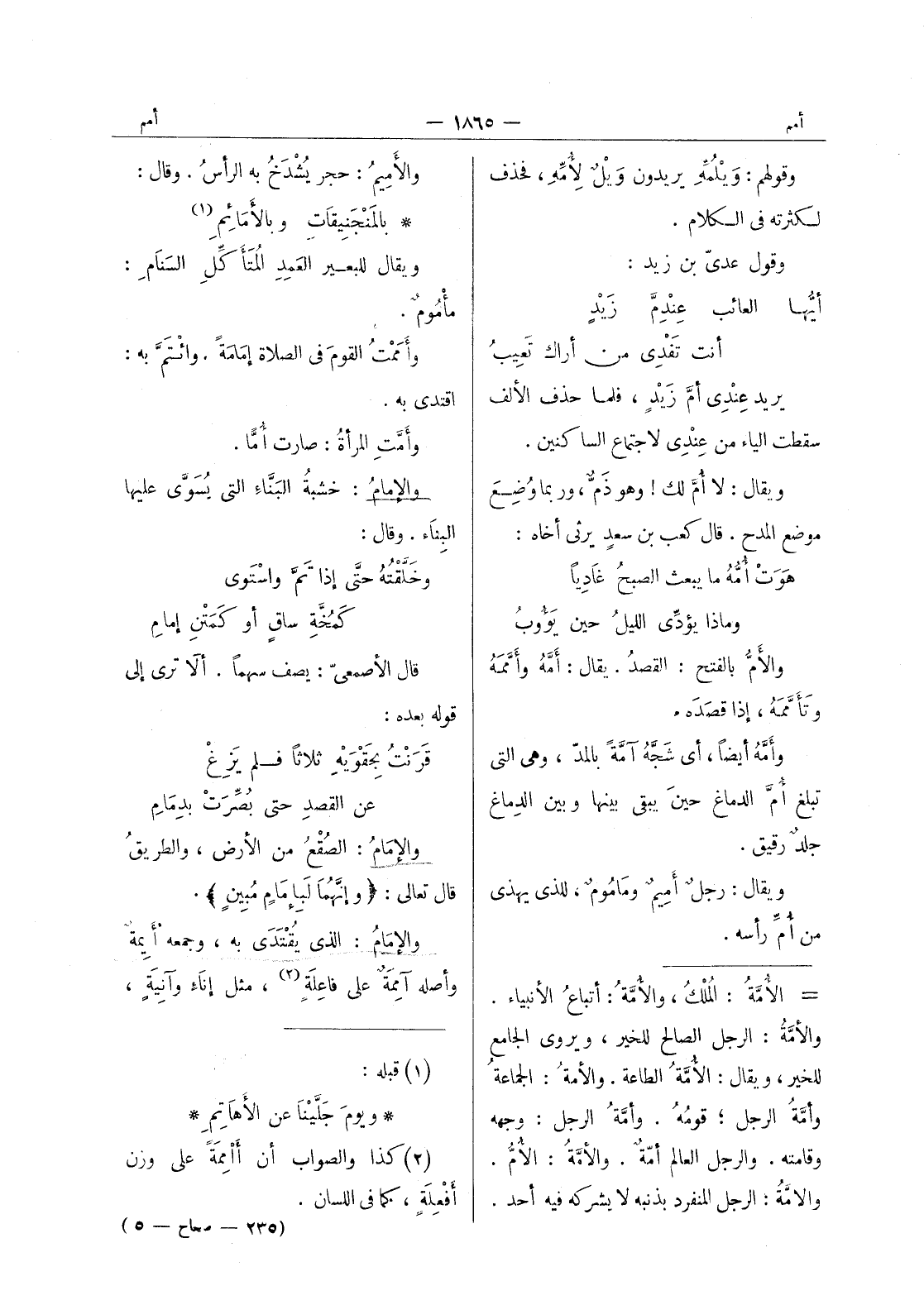 بالمَنْجَنيقاتِ وبالأَمائِمِ (¬1) ويقال للبعير العمد المتأكل السنام: مأْمومٌ. وأَمَمْتُ القومَ في الصلاة إمامَةً. وائْتَمَّ به: اقتدى به. وأَمَّتِ المرأةُ: صارت أُمَّاً. والإمامُ: خشبةُ البَنَّاءِ التي يُسَوَّى عليها البناء. وقال: وخلقته حتى إذا تم واستوى كمخة ساق أو كمتن إمام قال الاصمعي: يصف سهما. ألا ترى إلى قوله بعده: قرنت بحَقْوَيْهِ ثلاثاً فلم يَزُغْ عن القصد حتى بصرت بدمام والامام: الصقع من الارض، والطريق قال تعالى: (وإنهما لبإمام مُبين) . والإمامُ: الذي يُقْتَدى به، وجمعه أيمة وأصله آممة على فاعلة (¬2) ، مثل إناء وآنية،