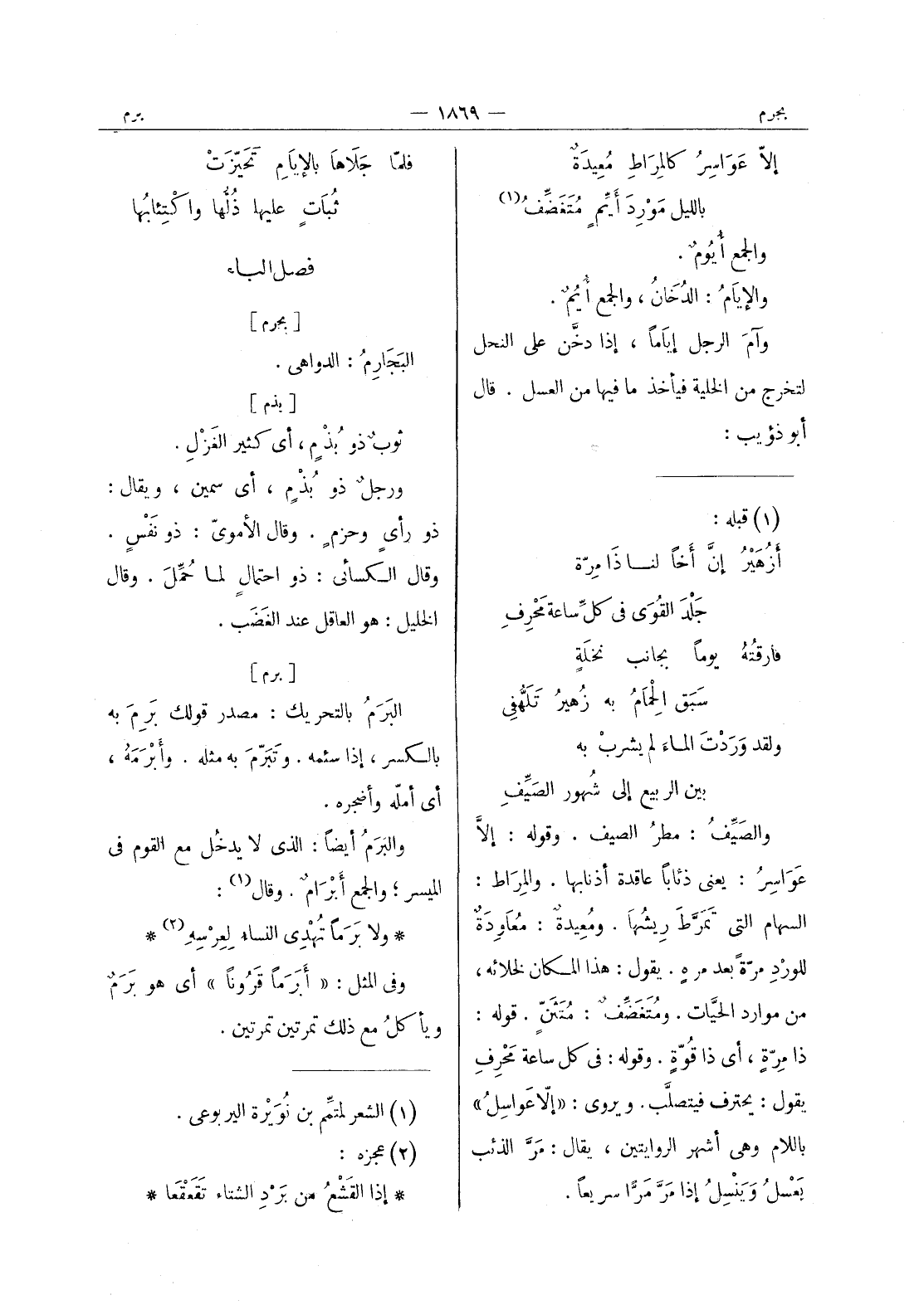 [برم] البَرَمُ بالتحريك: مصدر قولك بَرِمَ به بالكسر، إذا سئمه. وتَبَرّمَ به مثله. وأَبْرَمَهُ، أي أمّله وأضجره. والبَرَمُ أيضاً: الذي لا يدخُل مع القوم في الميسر، والجمع أَبْرامٌ. وقال (¬1) :