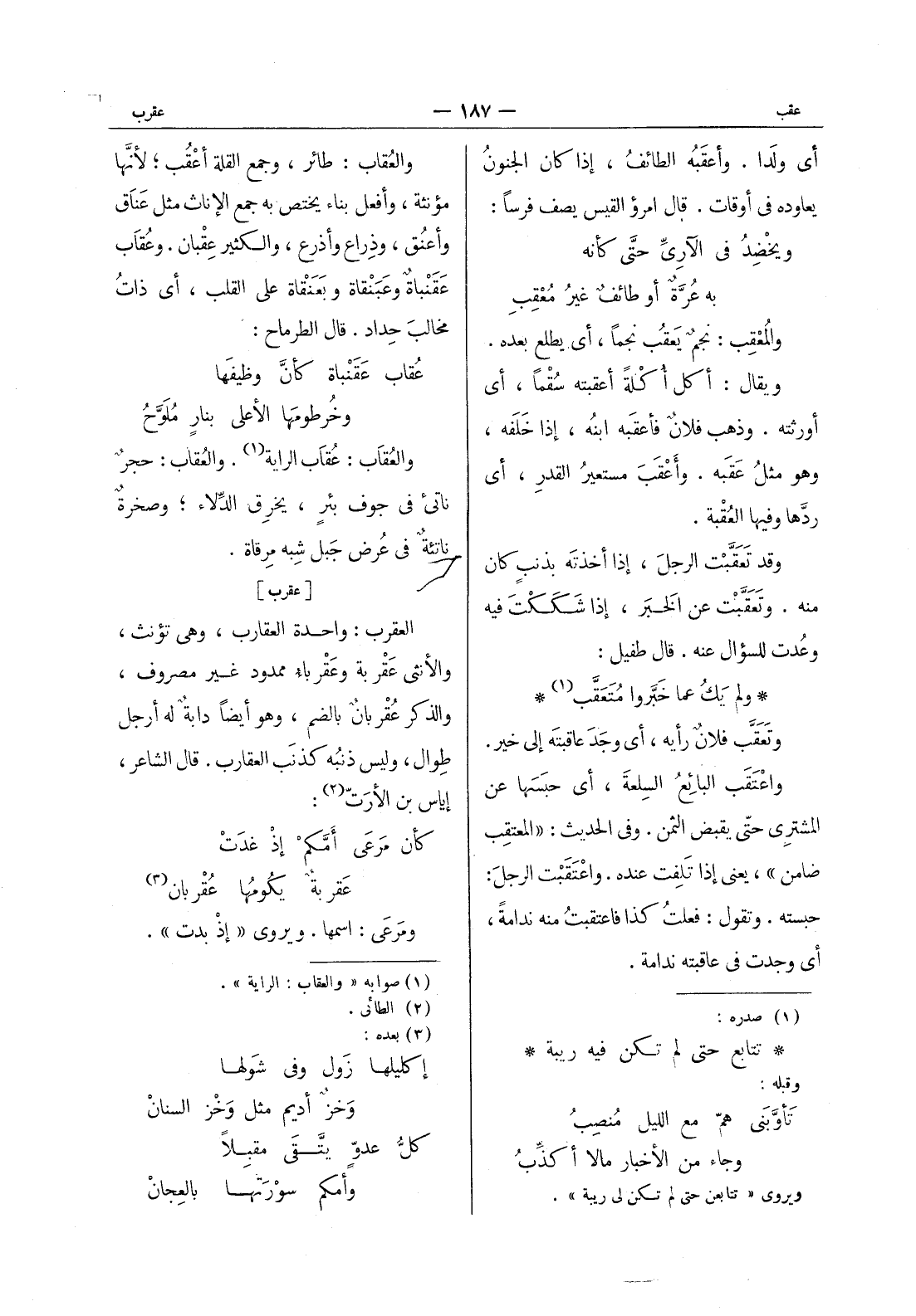 ولم يكُ عما خَبَّروا مُتَعَقَّب (¬1) * وتَعَقَّب فلانٌ رأيه، أي وجد عاقبتَه، إلى خير. واعْتَقَبَ البائع السِلعة، أي حبسها عن المشتري حتَّى يقبض الثمن. وفى الحديث: " المعتقب ضامن "، يعنى إذا تلفت عنده. واعتقبت الرجلَ: حبسته. وتقول: فعلت كذا فاعتقبتُ منه ندامةً، أي وجدت في عاقبته ندامة.