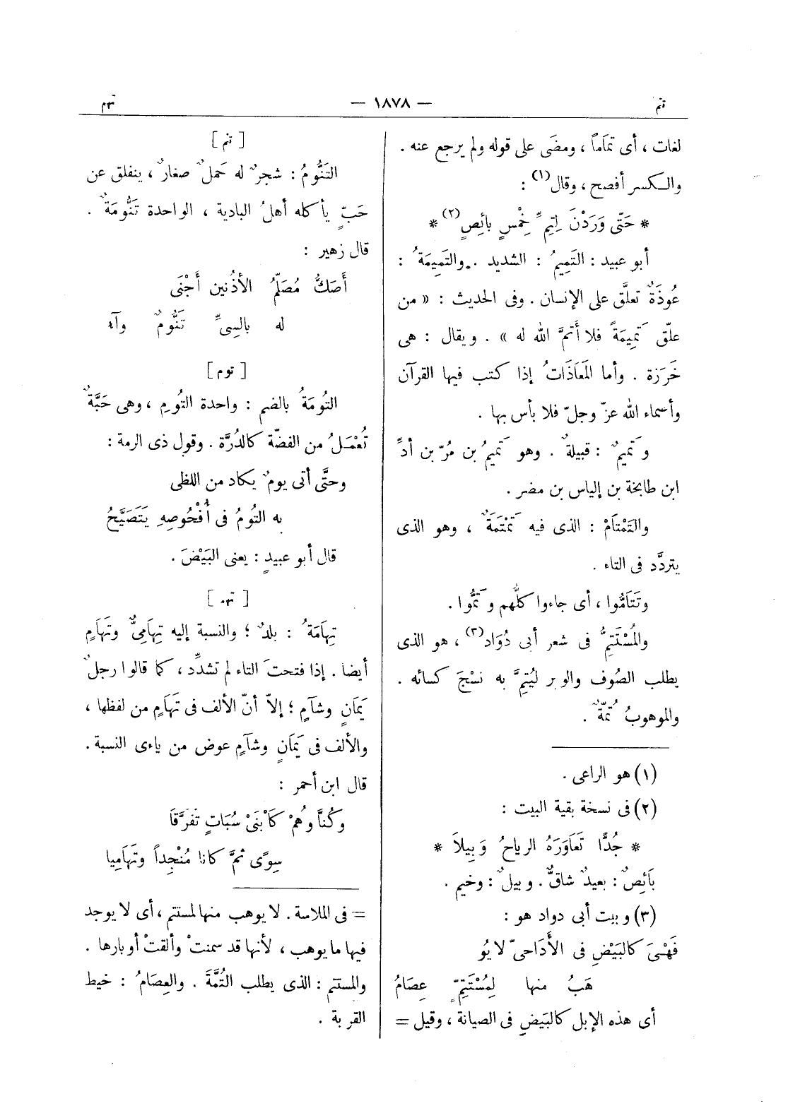 حتى وردن لتم خمس بائص (¬2) * أبو عبيد: التَميمُ: الشديد. والتَميمَة: عُوذَةٌ تعلَّق على الانسان. وفى الحديث: " من علق تميمة فلا أتم الله له ". ويقال: هي خرزة. وأما المعاذات إذا كتب فيها القرآن وأسماء الله عز وجل فلا بأس بها. وتميم: قبيلة. وهو تميم بن مر بن أد ابن طابخة بن إياس بن مضر. والتمتام: الذى في تمتمة، وهو الذي يتردَّد في التاء. وتتاموا، أي جاءوا كلهم وتموا. والمستتم في شعر أبى دواد (¬3) ، هو الذى يطلب الصوف والوبر ليتم به نسج كسائه. والموهوب تمة.