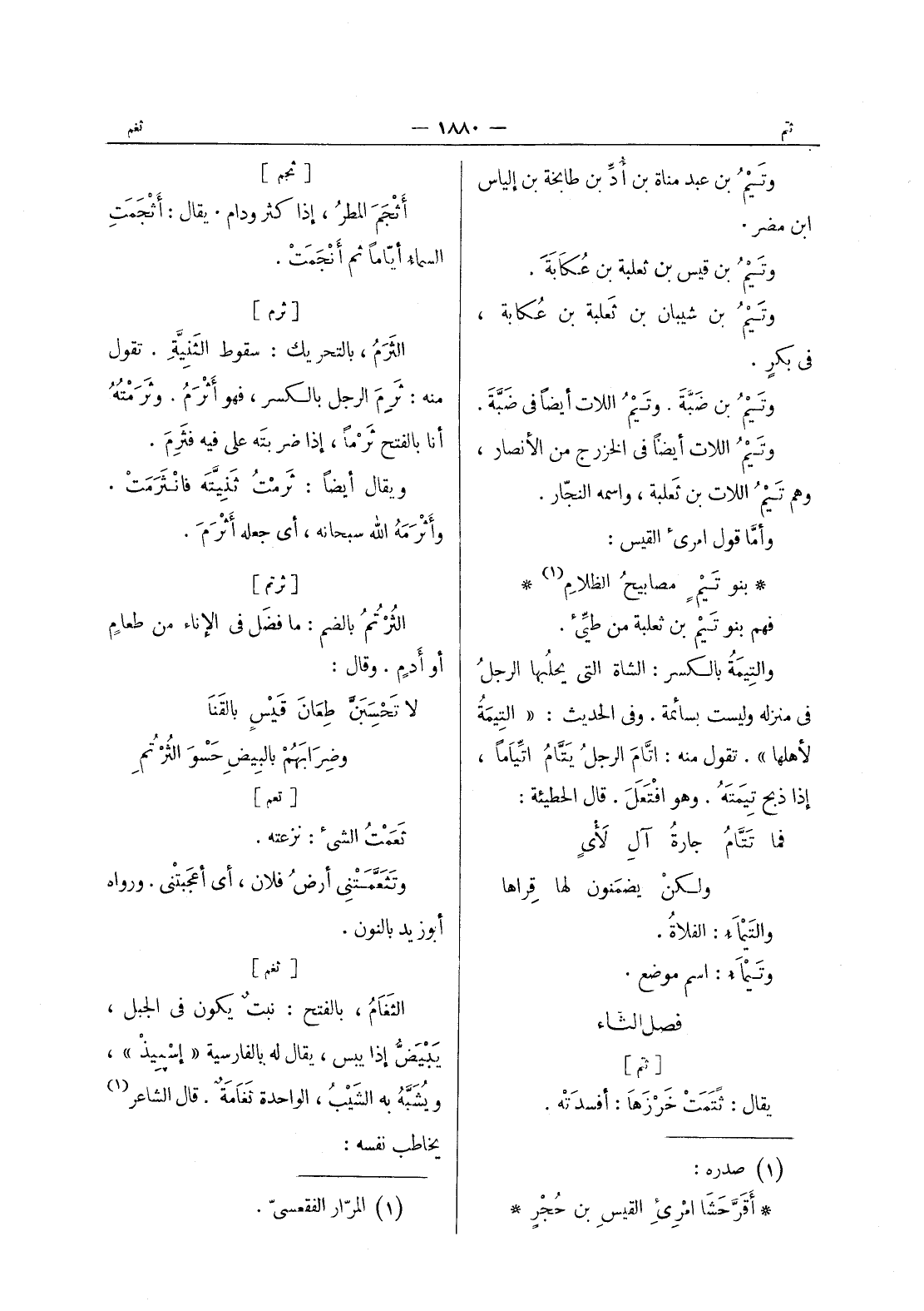 بنو تيم مصابيح الظلام (¬1) * فهم بنو تيم بن ثعلبة من طيئ. والتيمة بالكسر: الشاة التي يحلبها الرجلُ في منزله وليست بسائمة. وفي الحديث: " التيمَةُ لأهلها ". تقول منه: أتَّامَ الرجل يتام ايتاما، إذا ذبح تيمته. وهو افتعل. قال الحطيئة: فما تتام جارة آلِ لأْيٍ ولكنْ يضمَنون لها قراها والتيماء: الفلاة. وتيماء: اسم موضع.