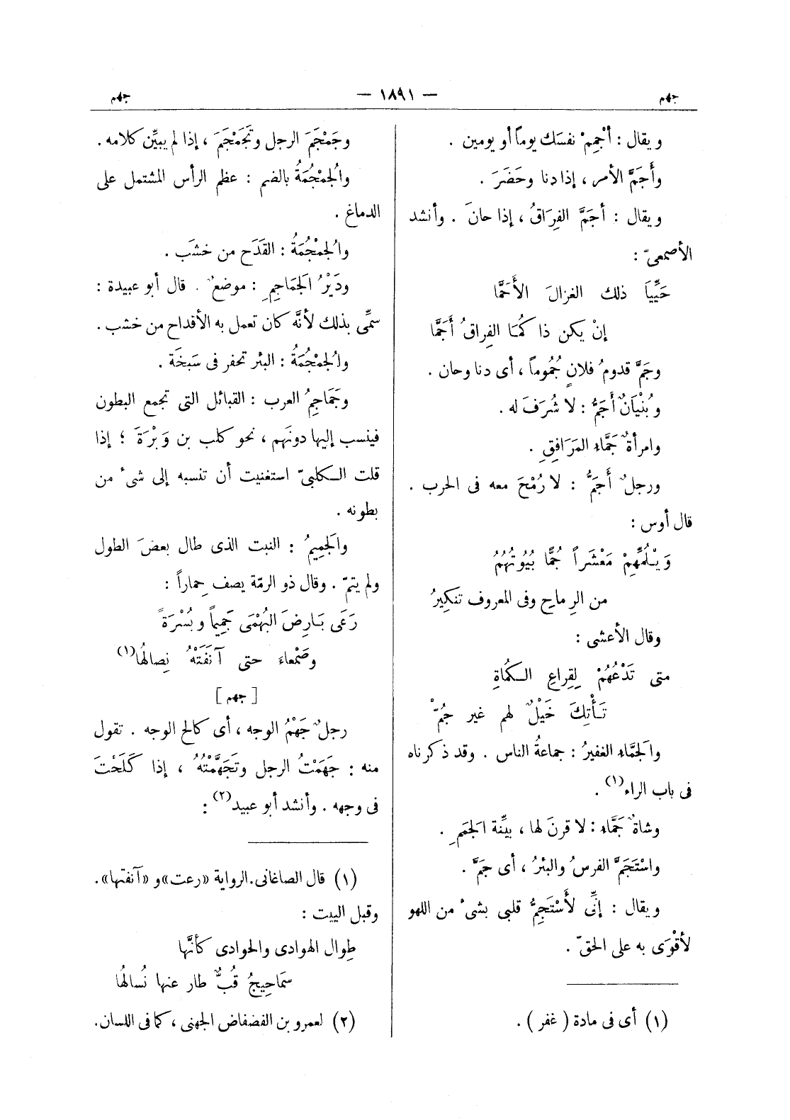 ويقال: أجْمِمْ نفسَك يوماً أو يومين. وأَجَمَّ الأمر، إذا دنا وحَضَرَ. ويقال: أَجَمَّ الفِراقُ، إذا حانَ. وأنشد الأصمعيّ: حَيِّيا ذلك الغزال الاحما إن يكن ذا كما الفِراقُ أَجَمَّا وجَمَّ قدومُ فلانٍ جموما، أي دنا وحان. وبنيان أجم: لا شرف له. وامرأة جَمَّاءُ المَرافِقِ. ورجلٌ أَجَمُّ: لا رُمْحَ معه في الحرب. قال أوس: وَيْلُمِّهِمْ مَعْشَراً جُمَّاً بُيوتُهُمُ من الرِماحِ وفي المعروف تنكير وقال الأعشى: متى تَدْعُهُمْ لِقِراعِ الكُماةِ تَأْتِكَ خَيْلٌ لهم غير جم والجماء الغفير: جماعة الناس. وقد ذكرناه في باب الراء (¬1) . وشاة جَمَّاءُ: لا قرنَ لها، بيِّنة الجَمَمِ. واسْتَجَمَّ الفرسُ والبئرُ، أي جَمَّ. ويقال: إنِّي لأَسْتَجِمُّ قلبي بشئ من اللهو لاقوى به على الحق.