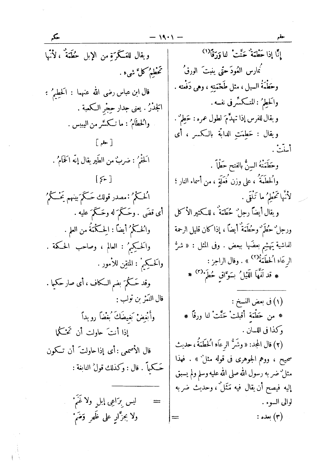 إنا إذا حَطْمَةٌ حَتَّتْ لنا وَرَقاً (¬1) نُمارس العودَ حتَّى ينبتَ الورقُ وحَطْمَةُ السيل، مثل طَحْمَتِهِ، وهي دَفْعته. والحطم: المتكسر في نفسه. ويقال للفرس إذا تهدَّمَ لطول عمره: حَطِمٌ. ويقال: حَطِمَتِ الدابّة بالكسر، أي أسنّتْ. وحَطَمَتْهُ السِنُّ بالفتح حطما. والحطمة، على وزن فعلة، من أسماء النار، لأنَّها تَحْطِمُ ما تَلْقى. ويقال أيضاً رجلٌ حُطَمَةٌ، للكثير الأكل ورجلٌ حُطَمٌ وحُطَمَةٌ أيضاً، إذا كان قليل الرحمة للماشية يَهشِم بعضَها ببعض. وفي المثل: " شرُّ الرعاء الحطمة (¬2) ". وقال الراجز: