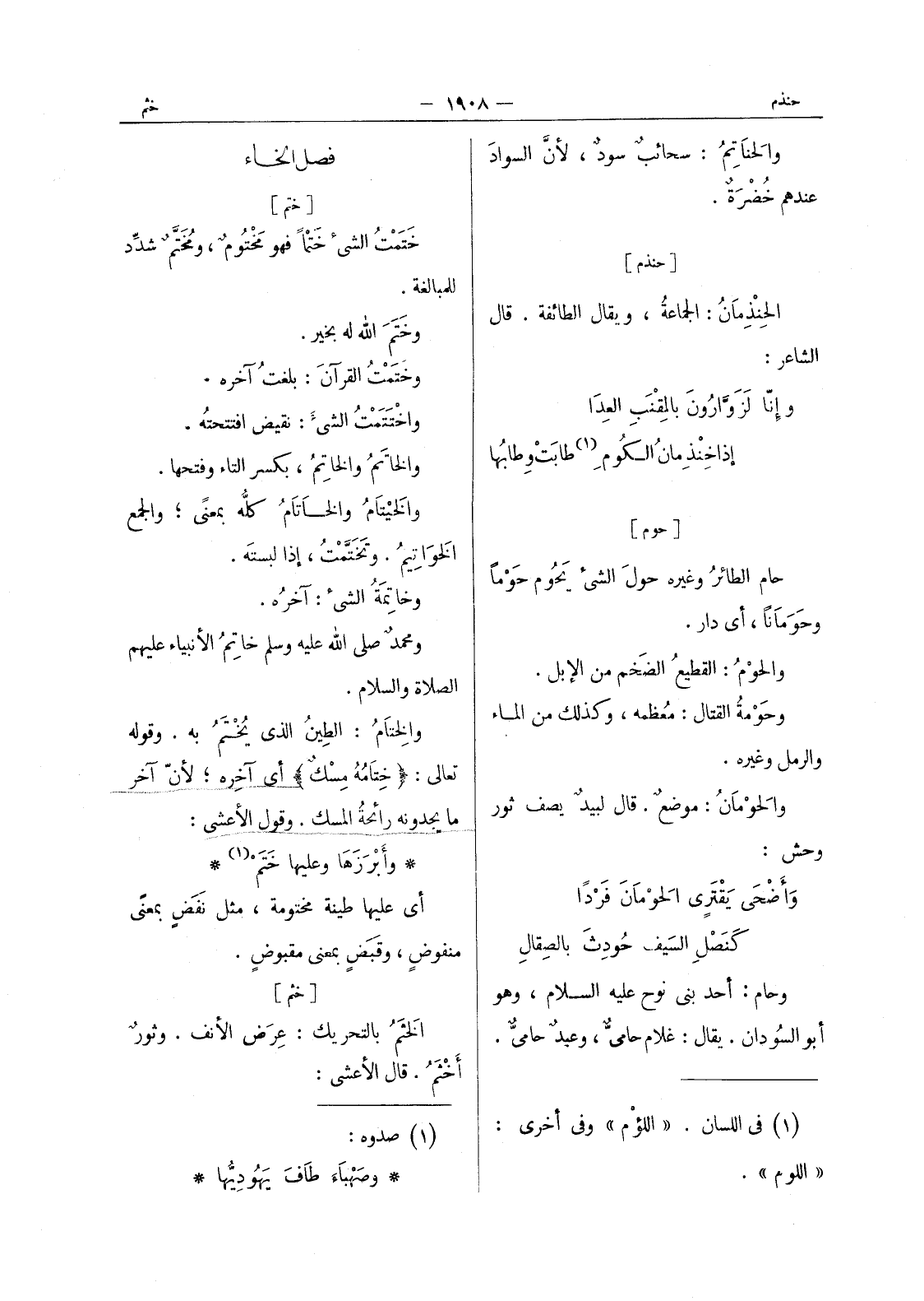 [حنذم] الحِنْذِمانُ: الجماعةُ، ويقال الطائفة. قال الشاعر: وإنّا لَزَوَّارونَ بالمِقْنَبِ العِدا إذا خِنْذِمانُ الكُوم (¬1) طابَتْ وطابها