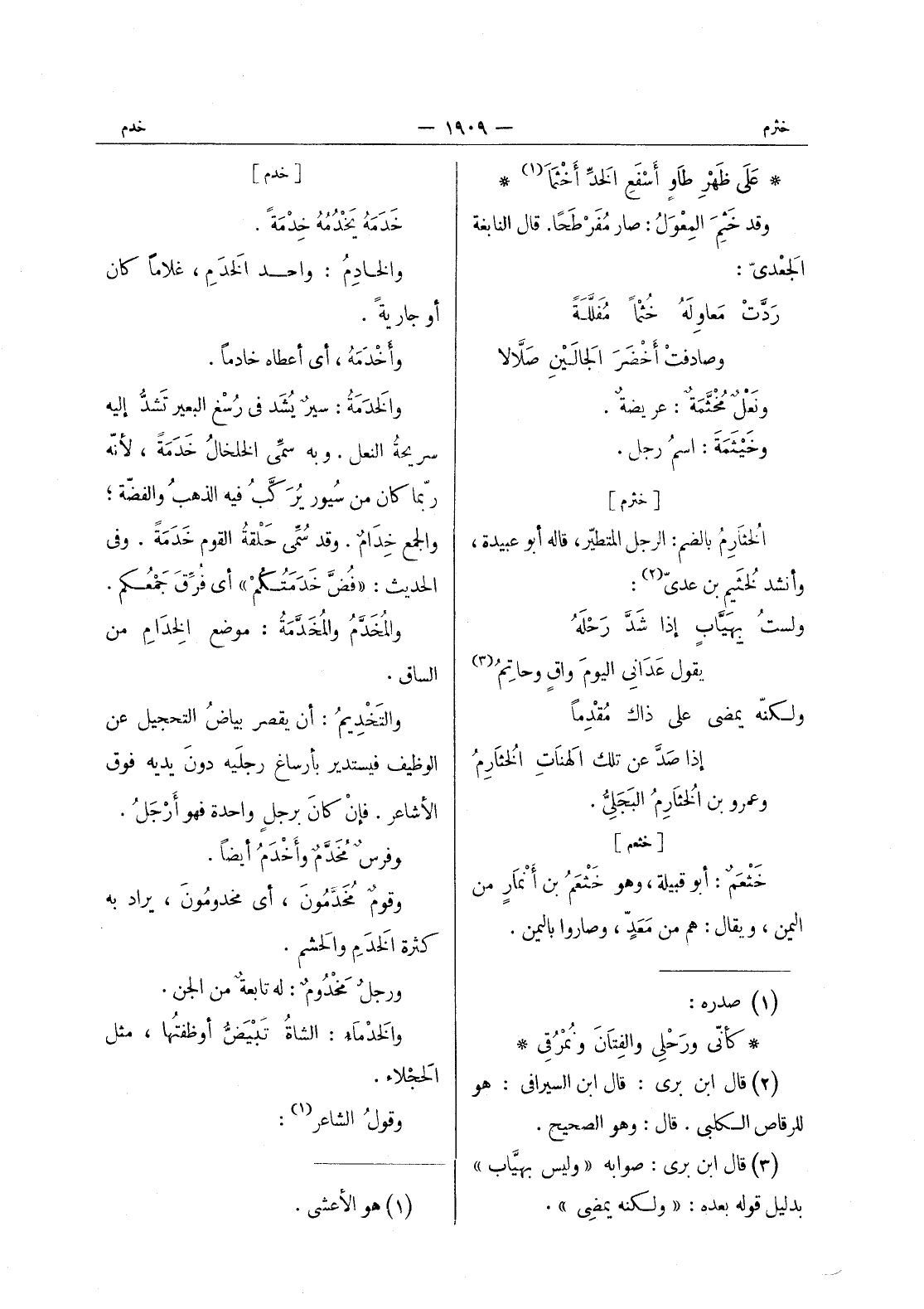 [خثرم] الخُثارِمُ بالضم: الرجل المتطيّر، قاله أبو عبيدة، وأنشد لخثيم بن عدى (¬2) : ولست بهياب إذا شَدَّ رَحْلَهُ يقول عَداني اليومَ واقٍ وحاتِمُ (¬3) ولكنّه يمضي على ذاك مُقْدِماً إذا صَدَّ عن تلك الهنات الخثارم وعمرو بن الخثارم البجلى.