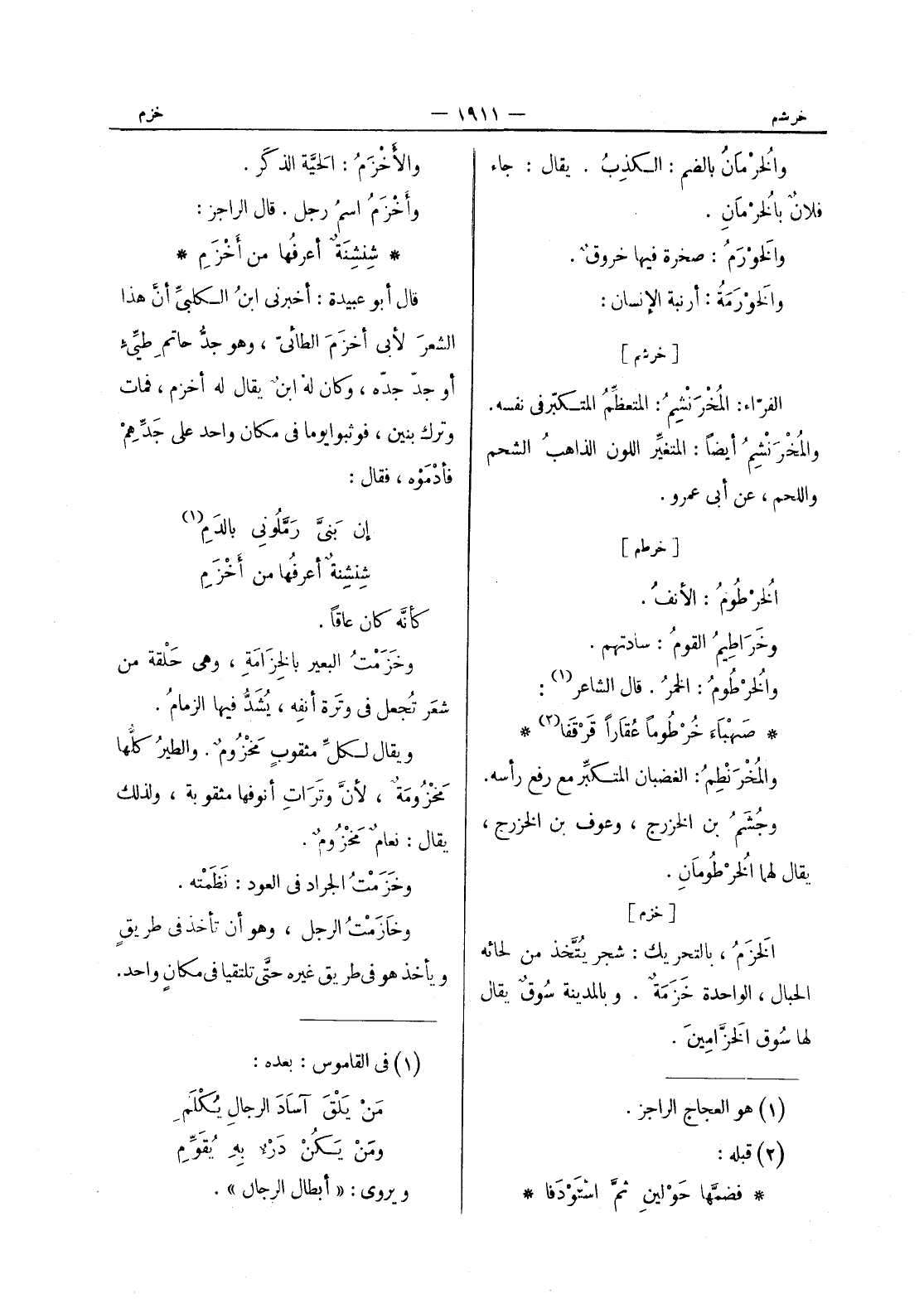 شِنْشِنَةٌ أعرفها من أَخْزَمِ * قال أبو عبيدة: أخبرني ابن الكلبى أن هذا الشعر لابي أخزم الطائى، وهو جد حاتم طيئ أو جد جده، وكان له ابن يقال له أخزم، فمات وترك بنين، فوثبوا يوما في مكان واحد على جدهم فأدموه، فقال: إن بنى رملوني بالدم (¬1) شنشنة أعرفها من أخزم كأنه كان عاقا. وخزمت البعير بالخِزامَةِ، وهي حَلْقة من شعَر تُجعل في وتَرة أنفِه، يُشَدُّ فيها الزمامُ. ويقال لكلِّ مثقوبٍ مَخْزومٌ. والطيرُ كلُّها مَخْزومَةٌ، لأنَّ وتَراتِ أنوفها مثقوبة، ولذلك يقال: نعامٌ مَخْزومٌ. وخَزَمْتُ الجراد في العود: نَظَمْته. وخازَمْتُ الرجل، وهو أن تأخذ في طريقٍ ويأخذ هو في طريق غيره حتَّى تلتقيا في مكانٍ واحد.