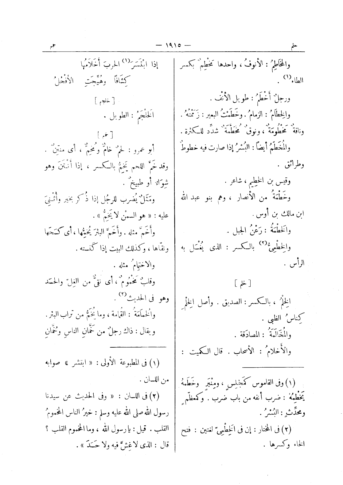 والمخاطم: الانوف، واحدها مَخْطِمٌ بكسر الطاء (¬1) . ورجلٌ أَخْطَمُ: طويلُ الأنْف. والخِطامُ: الزمامُ. وخَطَمْتُ البعير: زَمَمْتُهُ. وناقةٌ مَخْطومَةٌ، ونوقٌ مُخَطَّمَةٌ شدِّد للكثرة. والمُخَطَّمُ أيضاً: البُسْرُ إذا صارت فيه خطوطٌ وطرائق. وقيس بن الخطيم، شاعر. وخطمة من الانصار، وهم بنو عبد الله ابن مالك بن أوس. والخطمة: رعن الجبل. والخطمى (¬2) بالكسر: الذى يغسل به الرأس.