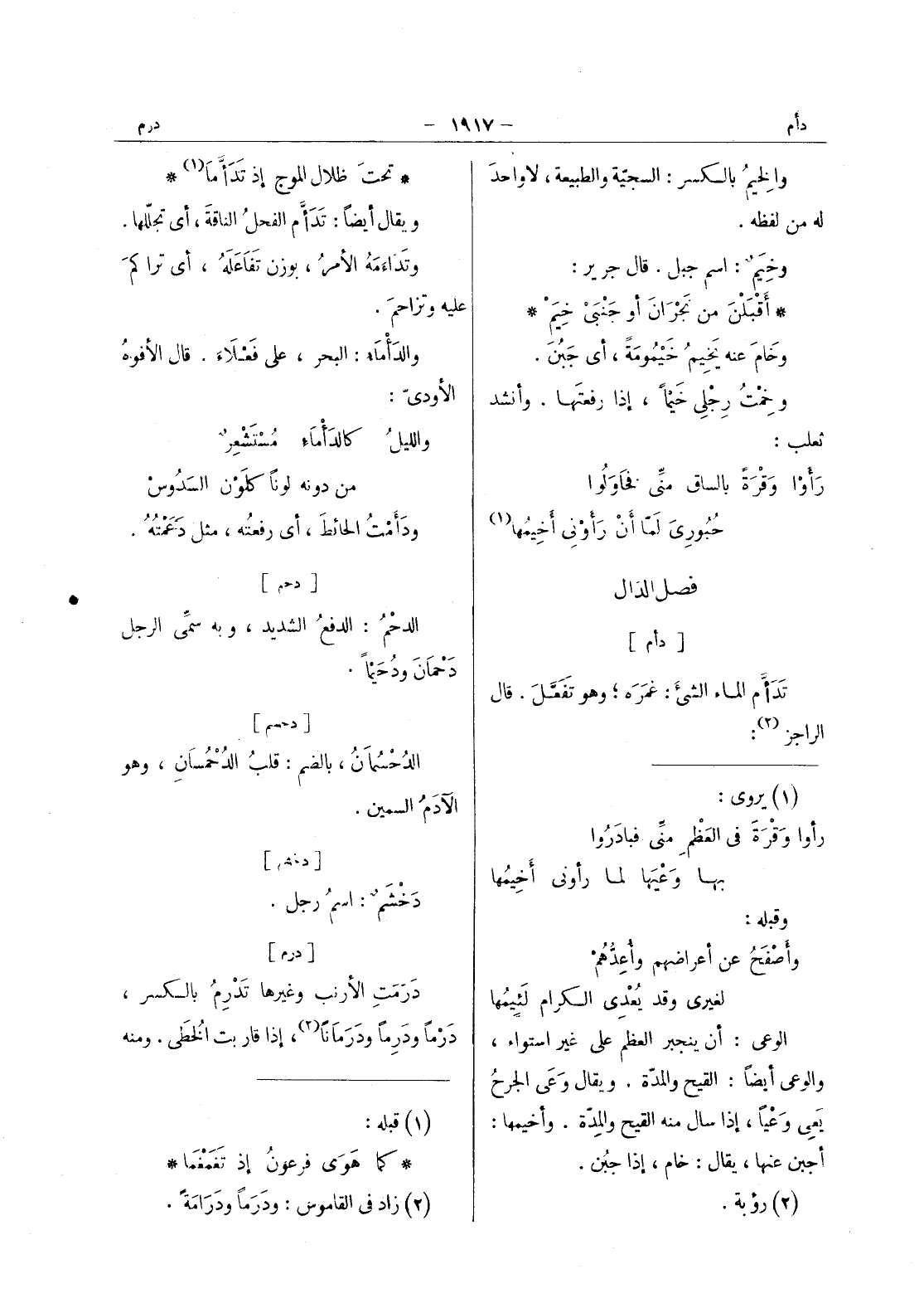 [دأم] تدأم الماء الشئ: غمره، وهو تفعل. قال الراجز (¬2)