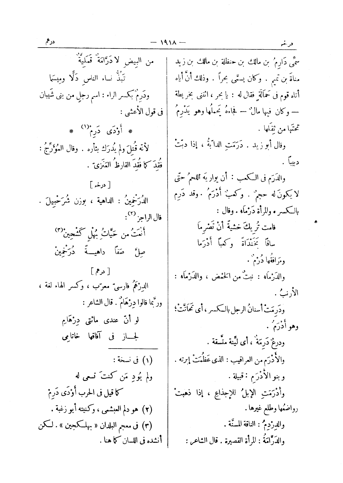 سمى دارم بن مالك بن حنظلة بن مالك بن زيد مناة بن تيمم. وكان يسمى بحرا. وذلك أن أياه أتاه قوم في حمالة فقال له: يا بحر، ائتنى بخريطة - وكان فيها مال - فجاءه يحملها وهو يدرم تحتها من ثقلها. وقال أبو زيد. درمت الدابة، إذا دبّتْ دبيباً. والدَرَم في الكعب: أن يواريَه اللحمُ حتّى لا يكونَ له حجمٌ. وكعبٌ أدْرَمُ. وقد درم بالكسره والمرأة درماء. وقال: قامت تُريك خشيةً أن تَصرِما ساقاً بخنداة وكعبا أدرما ومَرافقُها دُرْمٌ. والدَرْماءُ: نبتٌ من الحَمْض، والدَرْماءُ: الأرنب. ودَرِمَتْ أسنانُ الرجل بالكسر، أي تَحاتَّتْ، وهو أًدْرَمُ. ودرعٌ دَرِمةٌ، أي ليِّنة متَّسقة. والأدْرَمُ من العراقيب: الذي عظمت إبرته. وبنو الادرم: قبيلة. وأدرمت الابل للاجذاع، إذا ذهبتْ رواضعُها وطلع غيرها. والدردم: الناقة المسنة. والدَرَّامَةُ: المرأة القصيرة. قال الشاعر: