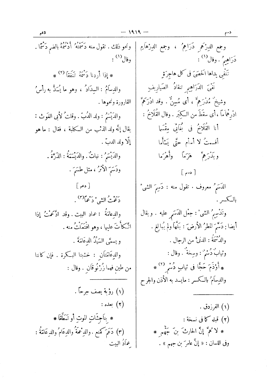 إذا أردنا دسمه تنفقا (¬2) * والدسام: السداد، وهو ما يُسَدُّ به رأسُ القارورة ونحوها. والدَيْسَمُ: ولد الدُبّ. وقلت لابي الغوث: يقال إنه ولد الذئب من الكلبة، فقال: ما هو إلا ولد الدب. والدَيْسَمُ: نباتٌ. والدَيْسَمَةُ: الذَرَّةُ. ودَسَمَ الاثر، مثل طسم.