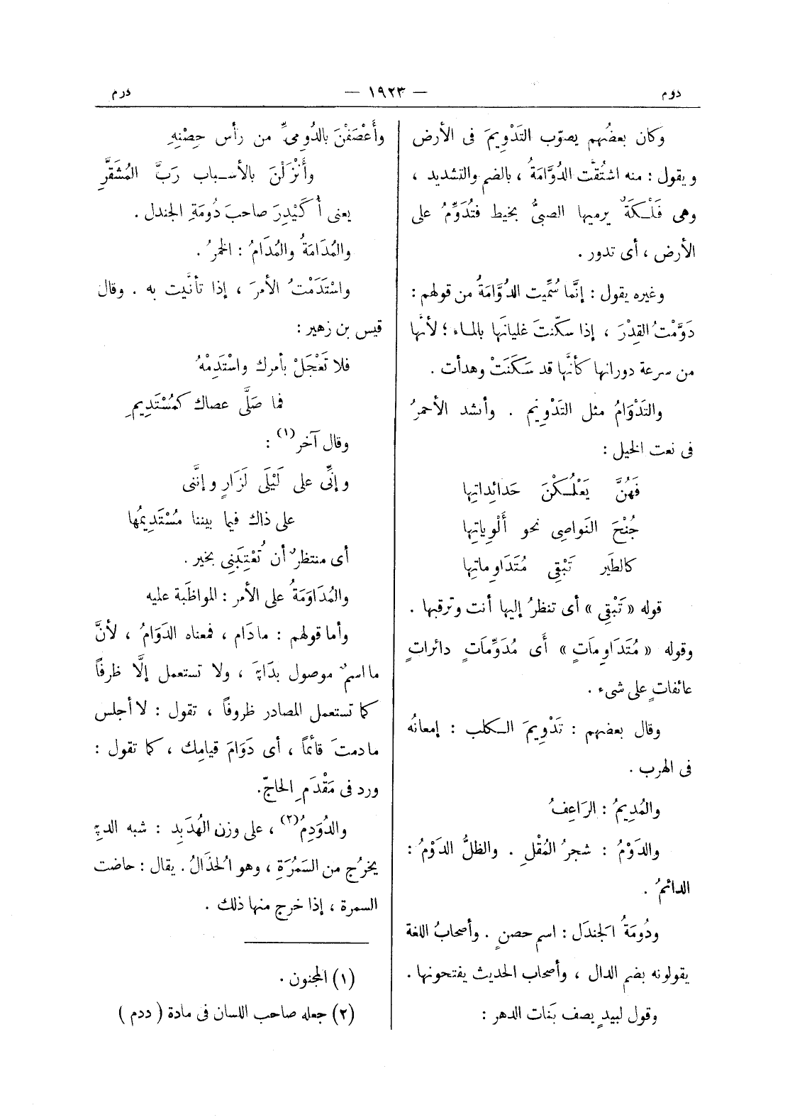 وأعصفن بالدومى من رأس حصنه وأنزلن بالاسباب رب المشقر يعنى أكيدر صاحب دومة الجندل. والمدامة والمُدامُ: الخمرُ. واسْتَدَمْتُ الأمرَ، إذا تأنيت به. وقال قيس بن زهير: فلا تعجل أمرك واسْتَدِمْهُ فما صَلَّى عَصاكَ كمُسْتَديمِ وقال آخر (¬1) : وإنى على لَيْلى لَزارٍ وإنَّني على ذاك فيما بيننا مُسْتَديمُها أي منتظرٌ أن تُعْتِبَني بخير. والمُداوَمَةُ على الأمر: المواظَبة عليه وأما قولهم: ما دام، فمعناه الدَوامُ، لان ما اسم موصول بداء، ولا تستعمل إلا ظرفا كما تستعمل المصادر ظروفا، تقول: لا أجلس مادمت قائما، أي دوام قيامك، كما تقول: ورد في مقدم الحاج. والدودم (¬2) ، على وزن الهدبد: شبه الد يخرج من السمرة، هو الحذال. يقال: حاضت: السمرة، إذا خرج منها ذلك.
