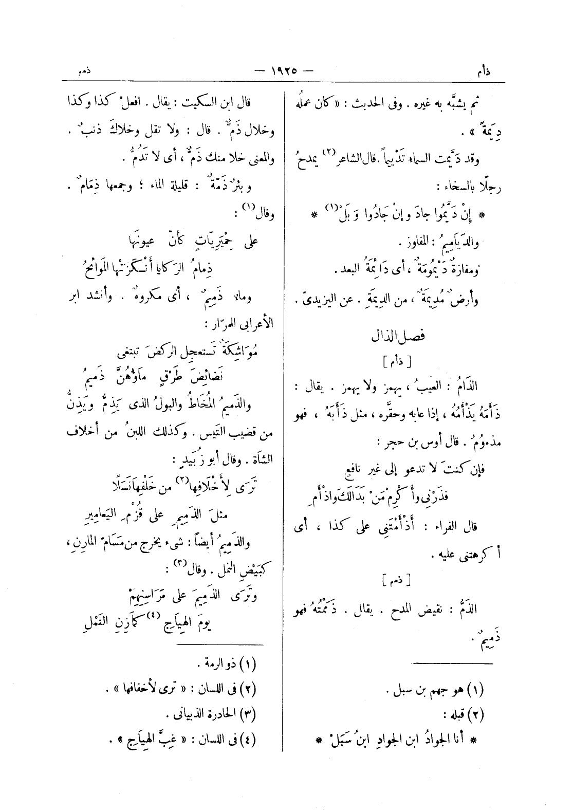 إنْ دَيِّموا جادَ وإن جادوا وَبَل (¬2) * والدَياميمُ: المفاوز. ومفازةٌ دَيْمومةٌ، أي دائِمة البعد. وأرضٌ مُديمَةٌ، من الديمَةِ. عن اليزيدى.