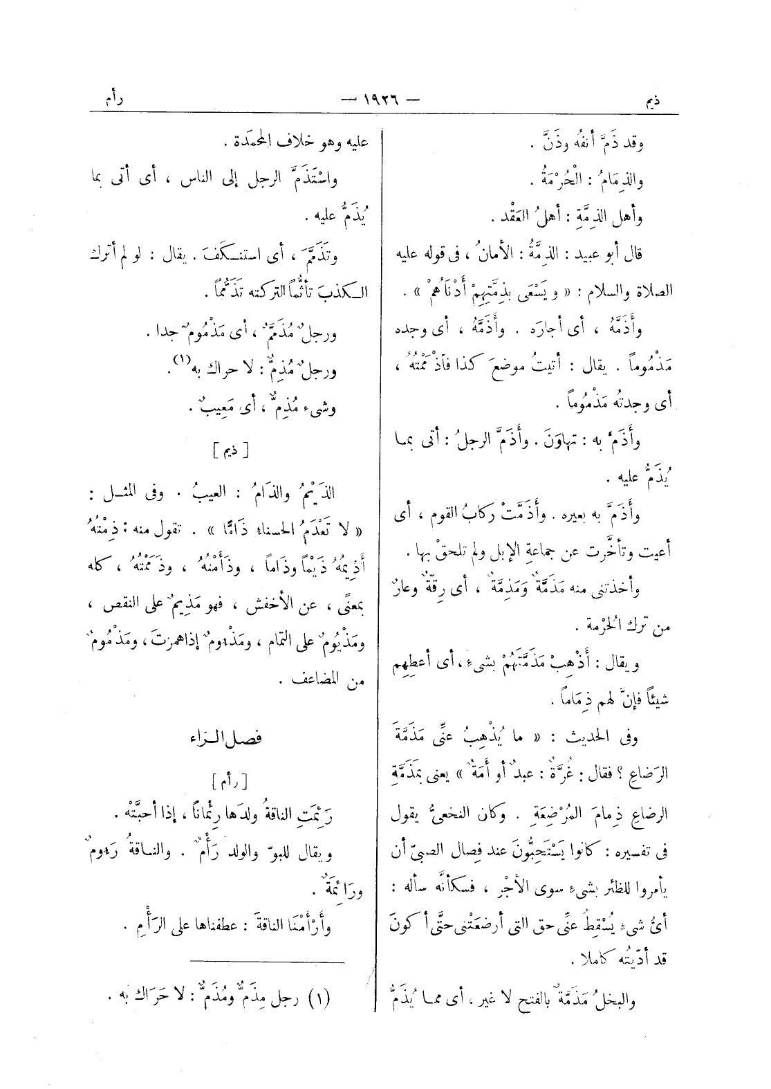 وقد ذم أنفه وذَنَّ. والذِمامُ: الحُرْمَةُ. وأهل الذِمَّةِ: أهلُ العَقْد. قال أبو عبيد: الذمَّةُ: الأمانُ، في قوله عليه الصلاة والسلام: " ويسعى بذمتهم أدناهم ". وأذَمَّهُ، أي أجارَه. وأَذَمَّهُ، أي وجده مَذموماً. يقال: أتيتُ موضعَ كذا فاذْمَمْتُهُ، أي وجدتُه مَذْموماً. وأَذَمَّ به: تهاوَنَ. وأَذَمَّ الرجلُ: أتى بما يُذَمُّ عليه. وأَذَمَّ به بعيره. وأَذَمَّتْ ركابُ القوم، أي أعيت وتأخَّرَتْ عن جماعة الإبل ولم تلحقْ بها. وأخذتني منه مَذَمَّةٌ ومَذِمَّةٌ، أي رِقّةٌ وعارٌ من ترك الحُرْمَةِ. ويقال: أذهب مذمتهم بشئ، أي أعطهم شيئا فإن لهم ذماما. وفي الحديث: " ما يذهب عنى مذمة الرضاع؟ فقال: غرة: عبد أو أمة " يعنى بمذمة الرضاع ذمام المرضعة. وكان النخعي يقول في تفسيره: كانوا يستحبون عند فصال الصبى أن يأمروا للظئر بشئ سوى الاجر، فسكأنه سأله: أي شئ يسقط عنى حق التى أرضعتني حتى أكون قد أديته كاملا. والبخل مَذَمَّةٌ بالفتح لا غير، أي مما يذم