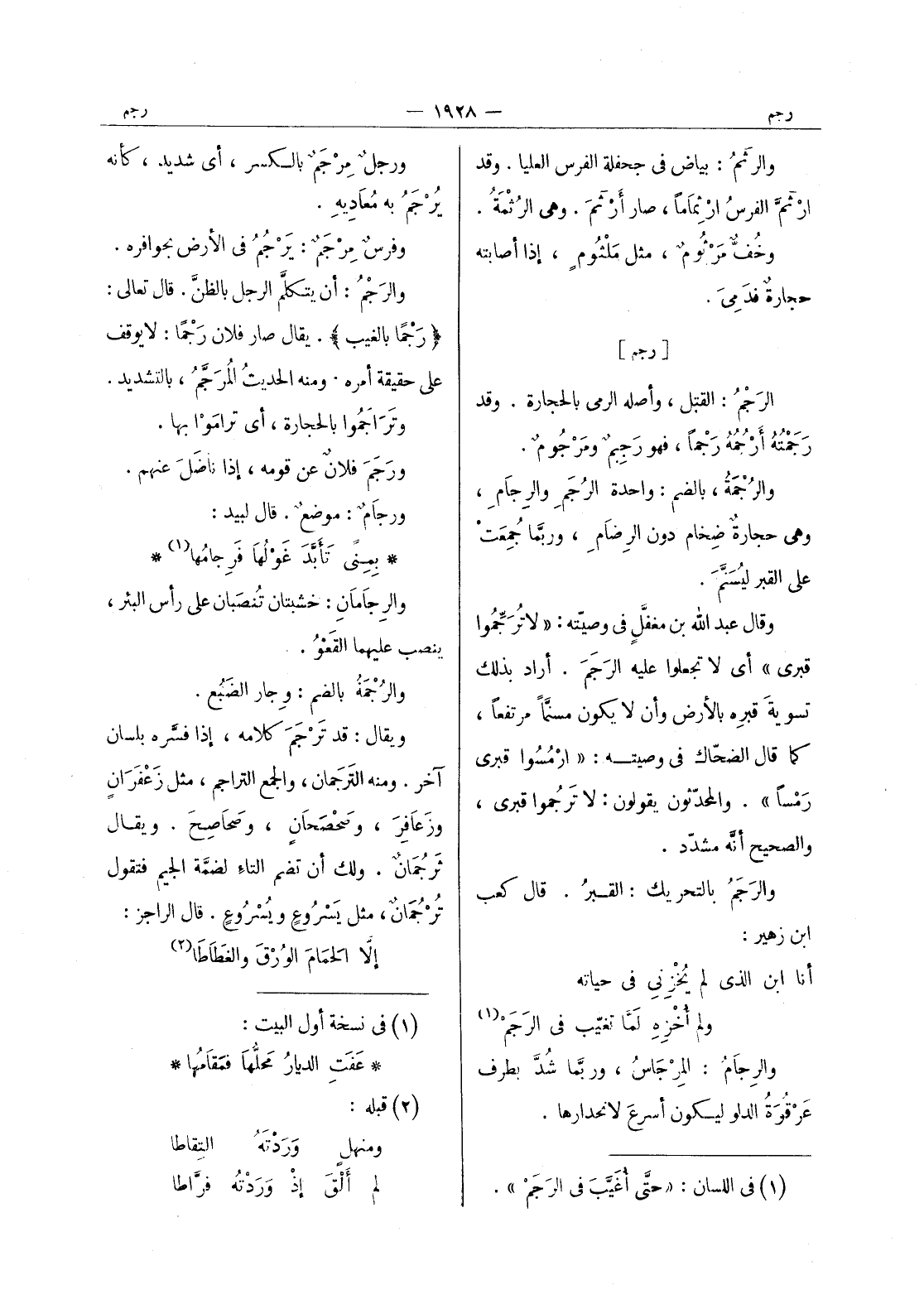 [رجم] الرَجْمُ: القتل، وأصله الرمي بالحجارة. وقد رَجَمْتُهُ أَرْجُمُهُ رَجْماً، فهو رجبم ومرجوم. والرجمة، بالضم: واحدة الرُجَمِ والرِجامِ، وهي حجارةٌ ضِخام دون الرِضامِ، وربَّما جُمِعَتْ على القبر ليُسَنَّمَ. وقال عبد الله بن مغفَّلٍ في وصيّته: " لا تُرَجَّموا قبري " أي لا تجعلوا عليه الرَجَمَ. أراد بذلك تسوية قبرِه بالأرض وأن لا يكون مسنما مرتفعا، كما قال الضحاك في وصيته: " ارمسوا قبري رمسا ". والمحدثون يقولون: لا ترجموا قبري، والصحيح أنه مشدد. والرجم بالتحريك: القبرُ. قال كعب ابن زهير: أنا ابن الذي لم يُخْزِني في حياته ولم أُخْزِهِ لَمَّا تَغَيَّب في الرَجَمْ (¬1) والرِجامُ: المِرْجاسُ، وربَّما شُدَّ بطرف عَرْقُوَةُ الدلو ليكون أسرع لانحدارها.