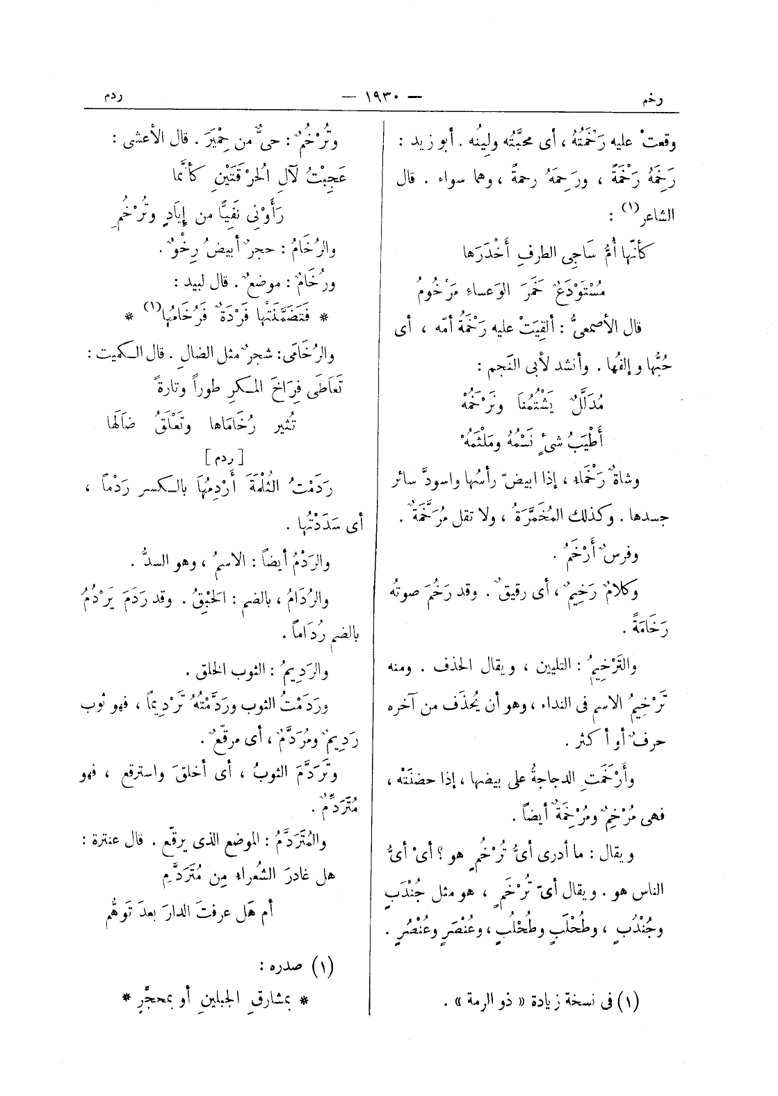 [ردم] رَدَمْتُ الثُلْمَةَ أَرْدِمُها بالكسر رَدْماً، أي سَدَدْتُها. والرَدْمُ أيضاً: الاسمُ، وهو السدُّ. والرُدامُ، بالضم: الحَبْقُ. وقد رَدَمَ يَرْدُمُ بالضم رُداماً. والرَديمُ: الثوب الخلق. ورَدَمْتُ الثوب ورَدَّمْتُهُ تَرْديماً، فهو ثوب رَديمٌ ومُرَدَّمٌ، أي مرقّعٌ. وتَرَدَّمَ الثوبُ، أي أخلقَ واسترقع، فهو مُتَرَدِّمٌ. والمُتَرَدَّمُ: الموضع الذي يرقّع. قال عنترة: هل غادرَ الشُعراءُ مِن مُتَرَدَّمِ أم هَل عرفتَ الدار بعد توهم