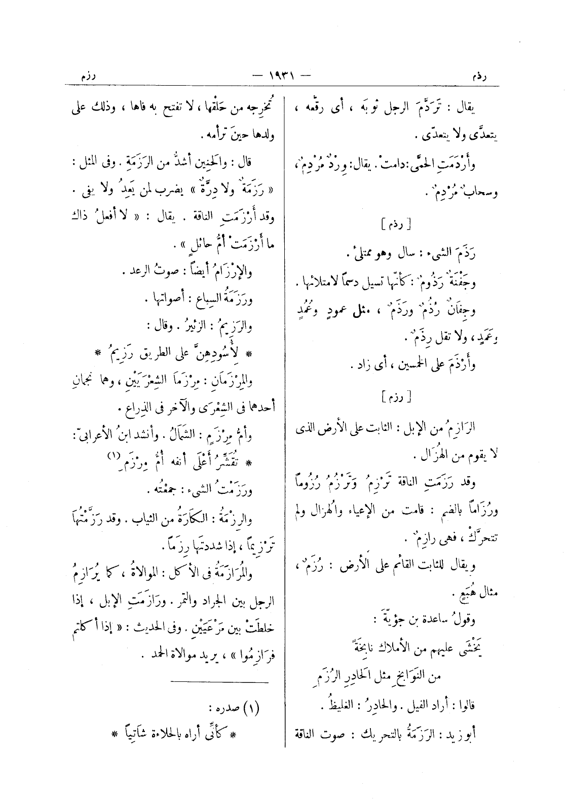 [رزم] الرازِمُ من الإبل: الثابت على الأرض الذي لا يقوم من الهُزال. وقد رَزَمَتِ الناقة تَرْزِمُ وَتَرْزُمُ رُزوماً ورُزاماً بالضم: قامت من الإعياء والهُزال ولم تتحرَّك، فهي رازِمٌ. ويقال للثابت القائم على الارض: رزم، مثال هبع. وقول ساعدة بن جؤية: يخشى عليهم من الأملاكِ نابخَةُ من النوابخ مثل الحادر الرزم قالوا: أراد الفيل. والحادر: الغليظ. أبو زيد: الرَزَمَةُ بالتحريك: صوت الناقة