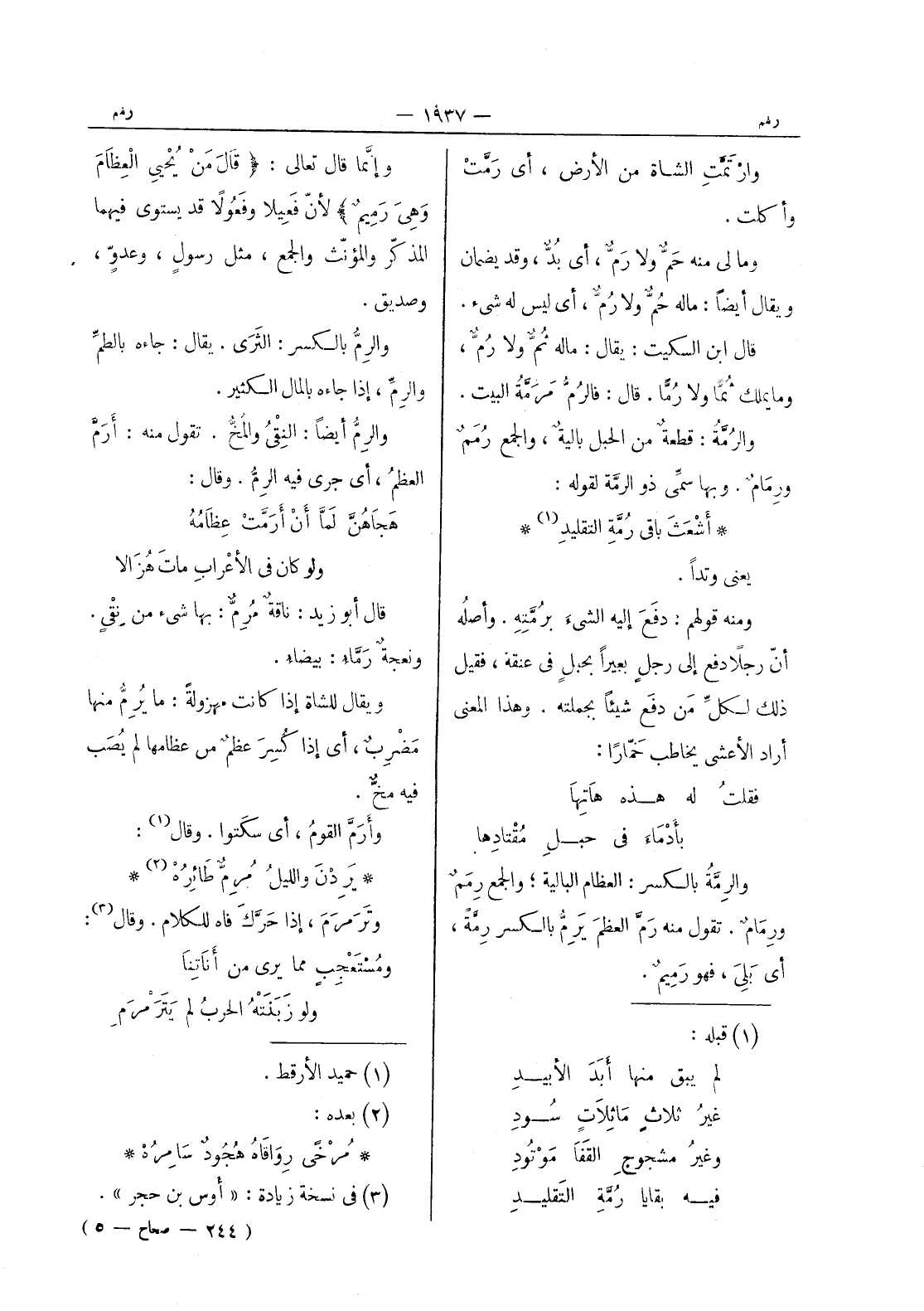 أشعث باقى رمة التقليد (¬1) * يعنى وتدا. ومنه قولهم: دفع إليه الشئ برمته. وأصله أن رجلا دفع إلى رجلٍ بعيراً بحبلٍ في عنقه، فقيل ذلك لكلِّ من دفَع شيئاً بجملته. وهذا المعنى أراد الأعشى يخاطب خَمّاراً: فقلتُ له هذه هاتِها بأَدْماءَِ في حبلِ مُقْتادِها والرِمَّةُ بالكسر: العظام البالية والجمع رِمَمٌ ورمامٌ. تقول منه رَمَّ العظمَ يَرِمُّ بالكسر رَمَّةً، أي بَلِيَ، فهو رميم.