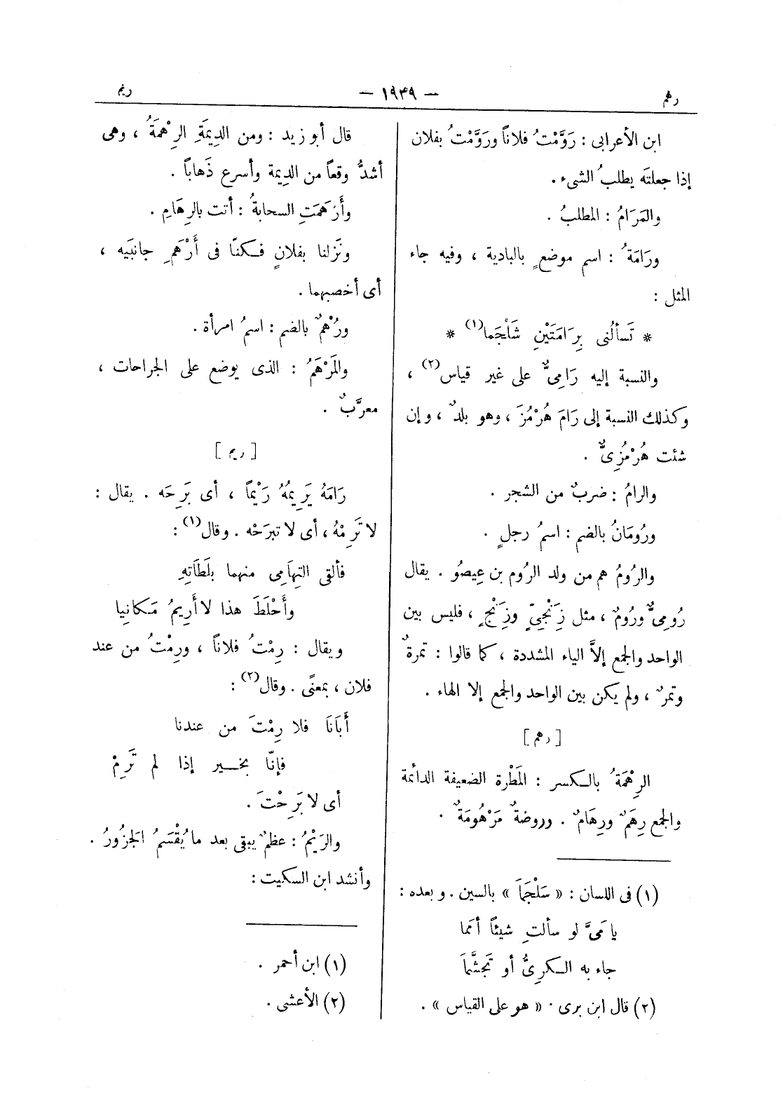 تسألني برامتين شلجما (¬1) * والنسبة إليه رامى على غير قياس (¬2) ، وكذلك النسبة إلى رام هرمز، وهو بلد، وإن شئت هرمزي. والرام: ضرب من الشجر. ورومان بالضم: اسم رجل. والروم هم من ولد الروم بن عيصو. يقال رومى وروم، مثل زنجى وزنج، فليس بين الواحد والجمع إلا الياء المشددة، كما قالوا: تمرة وتمر، ولم يكن بين الواحد والجمع إلا الهاء.
