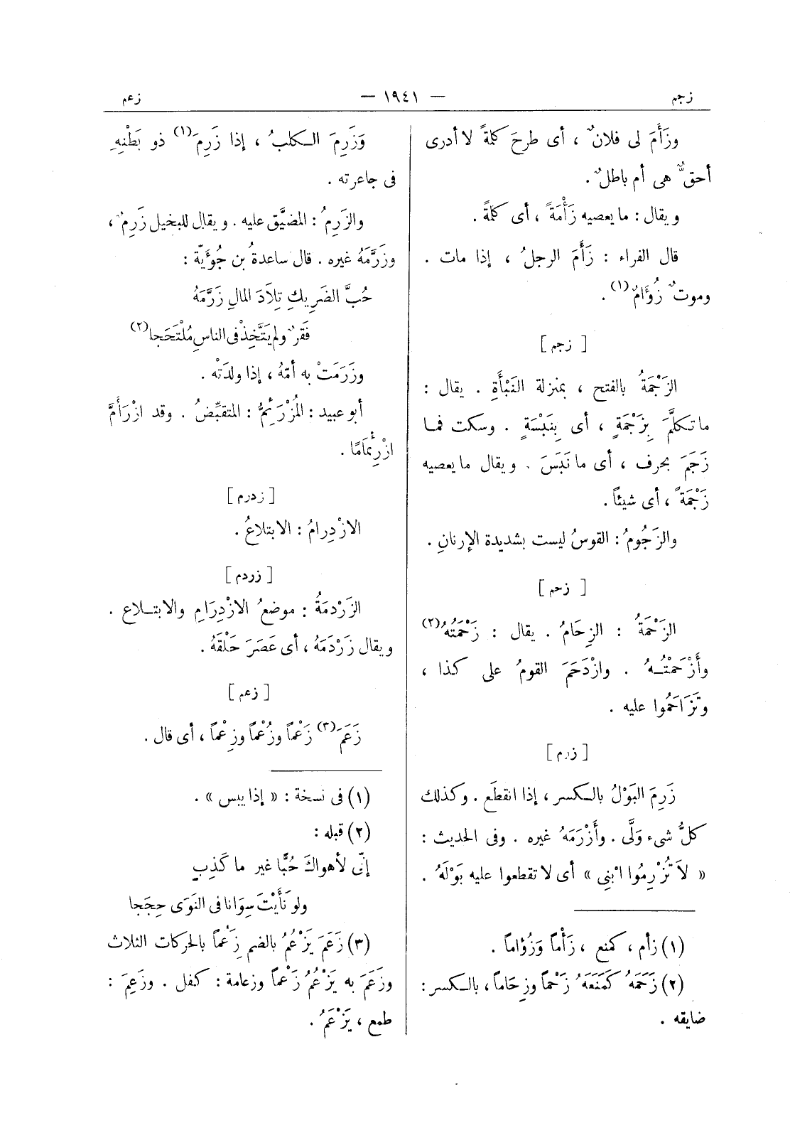 وزرم الكلب، إذا زَرِمَ (¬1) ذو بَطْنِهِ في جاعرته. والزَرِمُ: المضيَّق عليه. ويقال للبخيل زرم، وزرمه غيره. قال ساعدة بن جؤية: حب الضريك تلاد المال زرمه فقر ولم يتَّخِذْ في الناسِ مُلْتَحَجا (¬2) وزرمت به أمّهُ، إذا ولدَتْه. أبو عبيد: المُزْرَئِمُّ: المتقبِّضُ. وقد ازْرَأَمَّ ازْرِئْماماً.