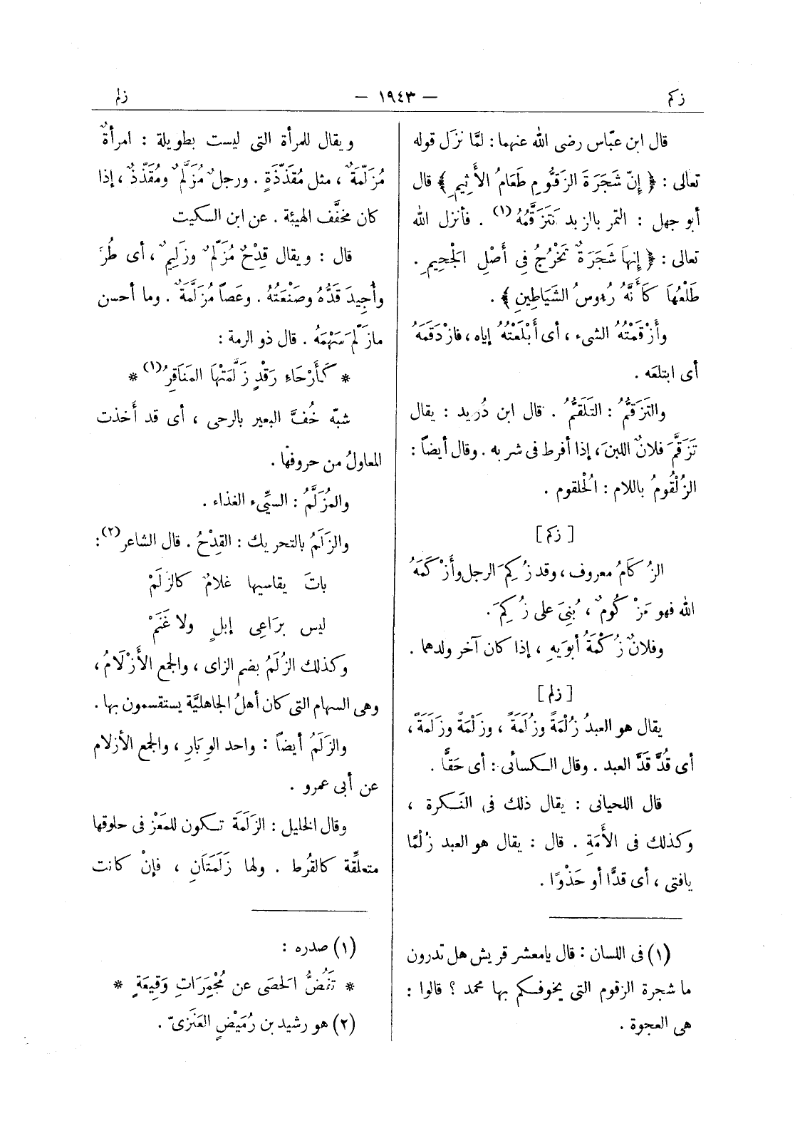 قال ابن عبّاس رضي الله عنهما: لمَّا نزَل قوله تعالى: (إنّ شَجَرَةَ الزَقُّومِ طَعامُ الأَثيمِ) قال أبو جهل: التمر بالزبد نتزقمه (¬1) . فأنزل الله تعالى: (إنها شَجَرَةٌ تَخْرُجُ في أَصْلِ الجَحيمِ. طَلْعُها كَأَنَّهُ رُءُوسُ الشَياطينِ) . وأَزْقَمْتُهُ الشئ، أي أبلعته إياه، فازدقمه أي ابتلعَه. والتَزَقُّمُ: التَلَقُّمُ. قال ابن دُريد: يقال تَزَقَّمَ فلانٌ اللبنَ، إذا أفرط في شربه. وقال أيضا: الزلقوم باللام: الحلقوم.