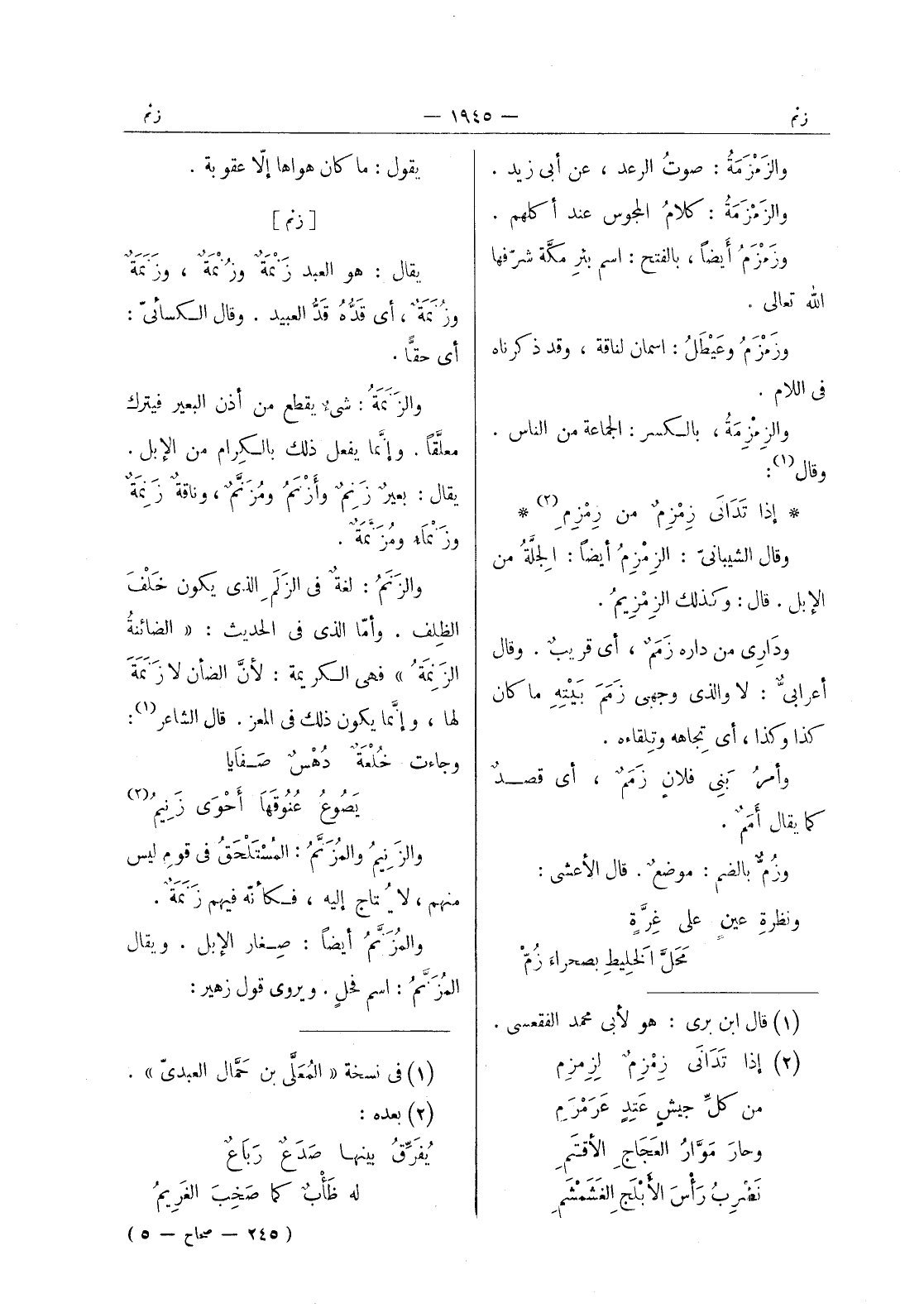 إذا تَدانى زِمْزِمٌ من زِمْزِم (¬2) * وقال الشيبانيّ: الزِمْزِمُ أيضاً: الجِلَّةُ من الإبل. قال: وكذلك الزمزيم. ودارى من داره زَمَمٌ، أي قريبٌ. وقال أعرابيٌّ: لا والذي وجهي زَمَمَ بَيْتِهِ ما كان كذا وكذا، أي تجاهه وتلقاءه. وأمر نبى فلانٍ زَمَمٌ، أي قصدٌ كما يقال أمم. وزم بالضم: موضع. قال الاعشى: ونظرة عين على غرة محل الخليط بصحراء زم