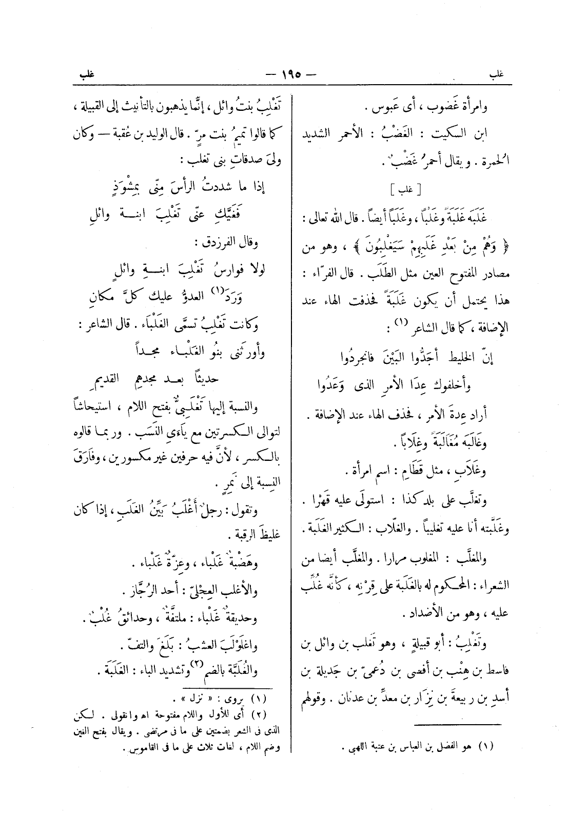 [غلب] غَلَبَهُ غَلَبَةً وغَلْباً، وغَلَباً أيضاً. قال الله تعالى: (وهم من بعد غلبهم سيغلبون) ، وهو من مصادر المفتوح العين مثل الطلب. قال الفراء: هذا يحتمل أن يكون غلبة فحذفت الهاء عند الاضافة، كما قال الشاعر (¬1) : إن الخليط أجدوا البين فانجردوا * وأخلفوك عدا الامر الذى وعدوا أراد عدة الامر، فحذف الهاء عند الاضافة. وغالبه مغالبة وغلابا. وغلاب، مثل قطام: اسم امرأة. وتغلب على بلد كذا: استولى عليه قهراً. وغَلَّبته أنا عليه تغليباً. والغلاّب: الكثير الغَلَبَة. والمغلَّب: المغلوب مراراً. والمغلَّب أيضا من الشعراء: المحكوم له بالغَلَبَة على قِرْنِهِ، كأنَّه غُلِّب عليه، وهو من الاضداد. وتغلب: أبو قبيلة، وهو تغلب بن وائل بن فاسط بن هنب بن أفصى بن دعمى بن جديلة بن أسد بن ربيعة بن نزار بن معد بن عدنان. وقولهم