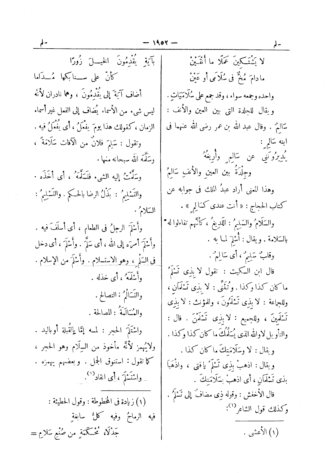 بآية يقدمون الخيل زورا كأن على سنابكها مداما أضاف آية إلى يقدمون، وهما نادران لانه ليس شي من الاسماء يضاف إلى الفعل غير أسماء الزمان، كقولك هذا يوم يفعل، أي يفعل فيه. وتقول: سلم فلان من الآفات سَلامَةً، وسَلَّمَه الله سبحانه منها. وسلمت إليه الشئ فتسلمه، أي أخَذَه. والتَسْليمُ: بَذْلُ الرضا بالحكم. والستليم: السلام. وأسلم الرجل في الطعام، أي أسلَفَ فيه. وأَسْلَمَ أمرَه إلى الله، أي سَلَّمَ. وأَسْلَمَ، أي دخل في السَلْمِ، وهو الاستسلام. وأَسْلَمَ من الإسلام. وأَسْلَمَهُ، أي خذله. والتَسالُمُ: التصالح. والمُسالَمَةُ: المصالحة. واسْتَلَمَ الحجر: لمسه إمَّا بالقُبلة أو باليد. ولا يهمز لانه مأخوذ من السلام وهو الحجر، كما تقول: استنوق الجمل. وبعضهم يهمزه. واستسلم، أي انقاد (¬1) .