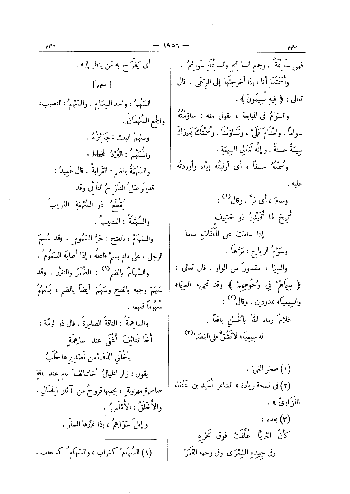 [سهم] السَهْمُ: واحد السِهامِ. والسَهْمُ: النصيب، والجمع السُهْمانُ. وسَهْمُ البيت: جائِزُهُ. والمُسَهَّمُ: البُرْدُ المخطط. والسُهْمَةُ بالضم: القَرابَةُ. قال عَبيدٌ: قد يوصَلُ النازِحُ النائي وقد يُقْطَعُ ذو السُهْمَةِ القريبُ والسُهْمَةُ: النصيبُ. والسَهامُ، بالفتح: حَرُّ السَمومِ. وقد سُهِمَ الرجل، على ما لم يسمَّ فاعلهُ، إذا أصابَه السَمومُ. والسُهامُ بالضم (¬1) : الضُمْرُ والتغيُّر. وقد سَهَمَ وجهه بالفتح وسَهُمَ أيضاً بالضم، يَسْهُمُ سُهوماً فيهما. والساهِمَةُ: الناقة الضامرة. قال ذو الرمة: أخا تنائف أغفى عند ساهمة بأخلق الدف من تصديرها جلب يقول: زار الخيال أخا تنائف نام عند ناقة ضامرة مهزولة، بجنبها قروح من آثار الحبال. والاخلق: الاملس. وإبل سواهم، إذا غيرها السفر.