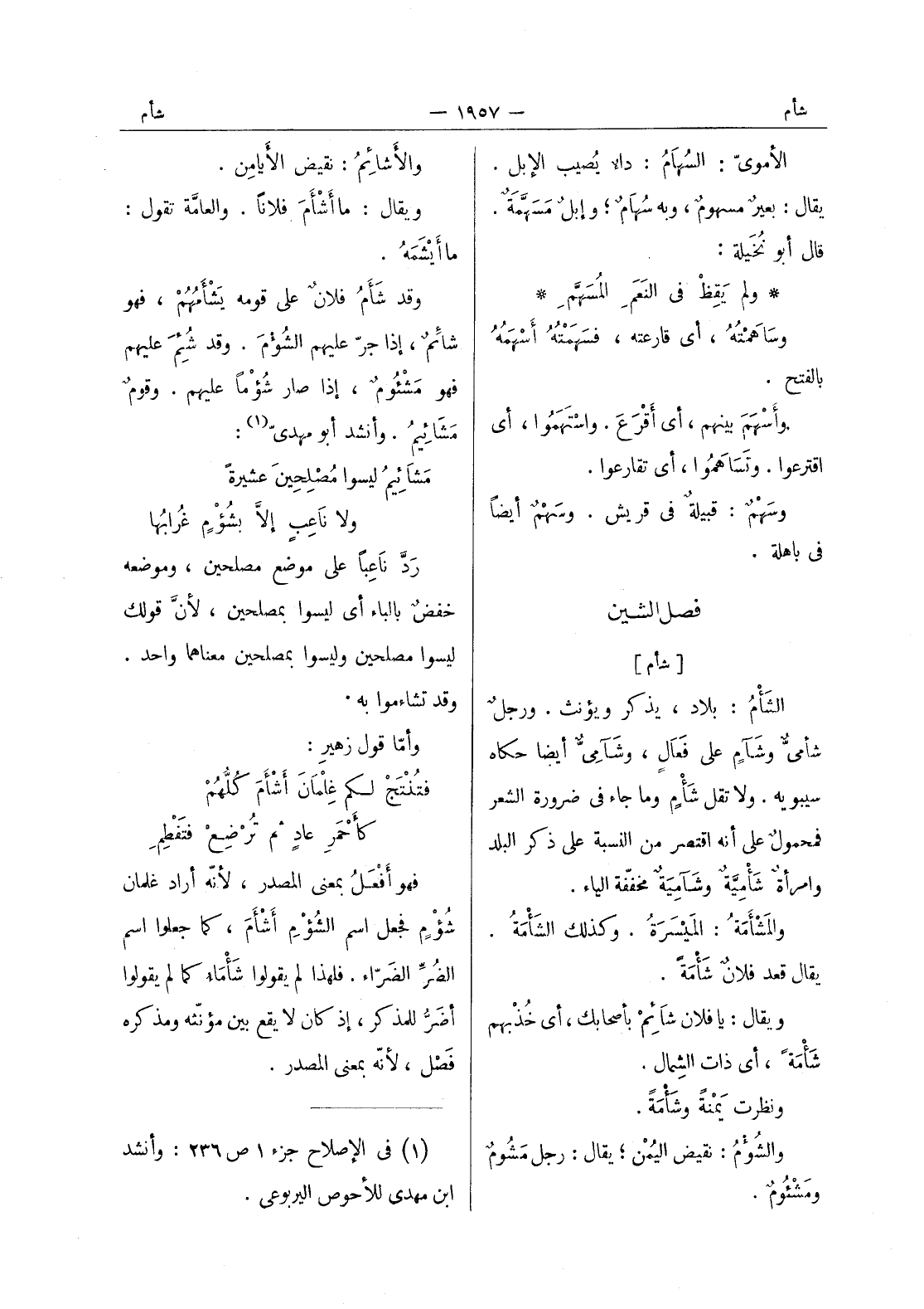 والاشائم: نقيض الايامن. ويقال: ما أشأم فلانا. والعامة تقول: ما أيشمه. وقد شأم فلانٌ على قومه يَشْأَمُهُمْ، فهو شائم، إذا جر عليهم الشؤم. وقد شُئِمَ عليهم فهو مَشْئُومٌ، إذا صار شُؤْماً عليهم. وقومٌ مَشائيمُ. وأنشد أبو مهدي (¬1) : مَشائيمُ ليسوا مُصْلِحينَ عشيرةً ولا ناعِبٍ إلاَّ بشُؤْمٍ غُرابُها رَدَّ ناعِباً على موضع مصلحين، وموضعه خفضٌ بالباء أي ليسوا بمصلحين، لان قولك ليسوا مصلحين وليسوا بمصلحين معناهما واحد. وقد تشاءموا به. وأما قول زهير: فتنتج لكم غلمان أشأم كلهم كأحمر عاد ثم ترضع فتفطم فهو أفعل بمعنى المصدر، لانه أراد غلمان شؤم فجعل اسم الشؤم أشأم، كما جعلوا اسم الضر الضراء. فلهذا لم يقولوا شأماء كما لم يقولوا أضر للمذكر، إذ كان لا يقع بين مؤنثه ومذكره فصل، لانه بمعنى المصدر.