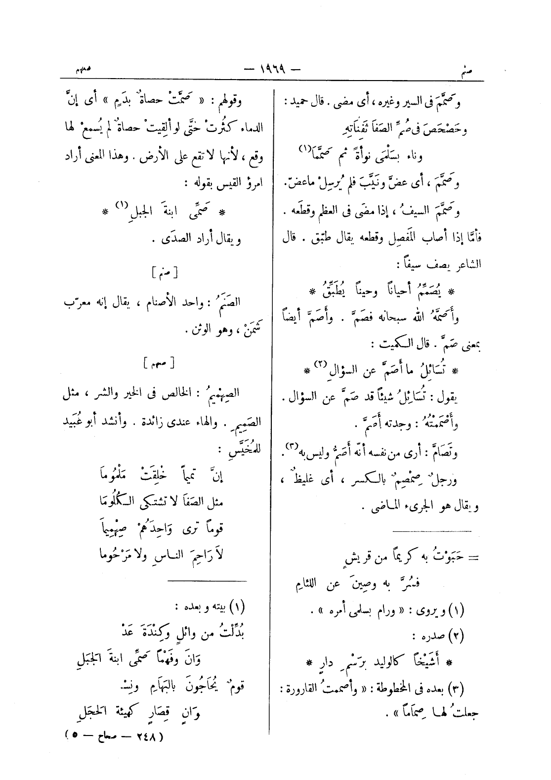 تُسائلُ ما أَصَمَّ عن السؤالِ (¬2) * يقول: تُسائِلُ شيئاً قد صَمَّ عن السؤال. وأَصْمَمْتُهُ: وجدته أَصَمَّ. وتَصامَّ: أرى من نفسه أنّه أصم وليس به (¬3) . ورجل صمصم بالكسر، أي غليظٌ، ويقال هو الجرئ الماضي.