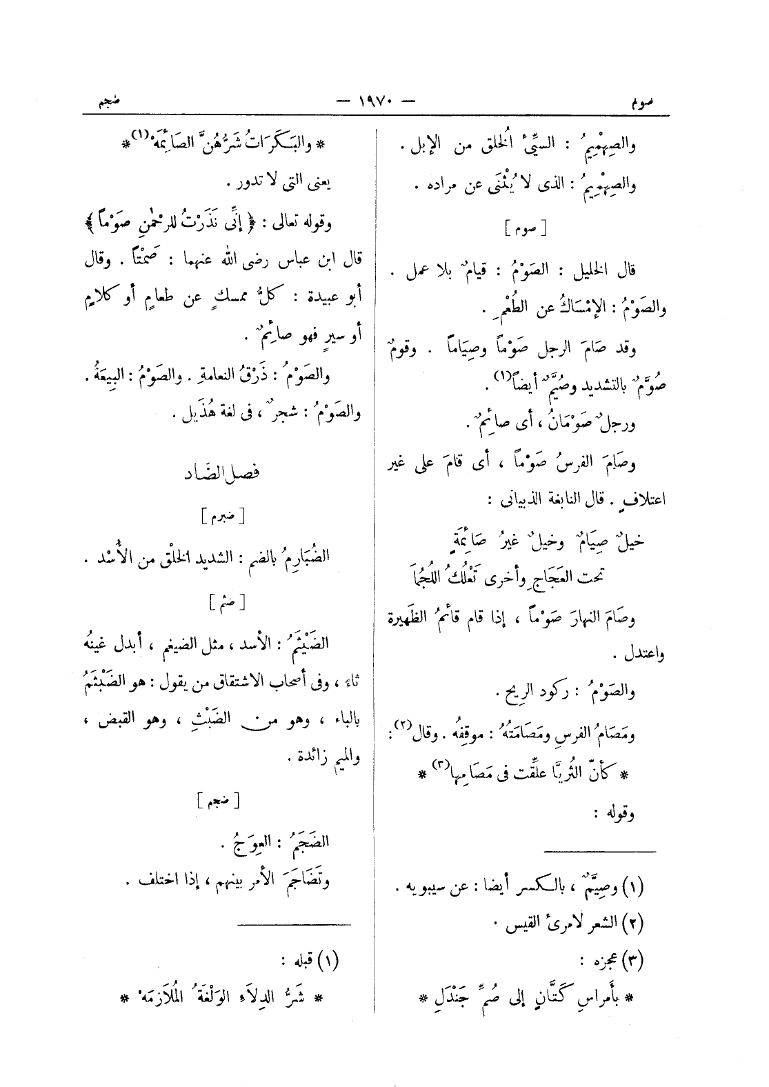 [صوم] قال الخليل: الصَوْمُ: قيامٌ بلا عمل. والصَوْمُ: الإمْساكُ عن الطُعْمِ. وقد صامَ الرجل صَوْماً وصِياماً. وقومٌ صُوَّمٌ بالتشديد وصُيَّمٌ أيضاً (¬1) . ورجلٌ صَوْمانُ، أي صائِمٌ. وصامَ الفرسُ صَوْماً، أي قامَ على غير اعتلافٍ. قال النابغة الذبياني: خيلٌ صِيامٌ وخيلٌ غيرُ صائِمَةٍ تحت العَجاجِ وأخرى تَعْلُكُ اللُجُما وصامَ النهارَ صَوْماً، إذا قام قائمُ الظَهيرة واعتدل. والصَوْمُ: ركود الريح. ومَصامُ الفرسِ ومَصامَتُهُ: موقِفُه. وقال (¬2) :
