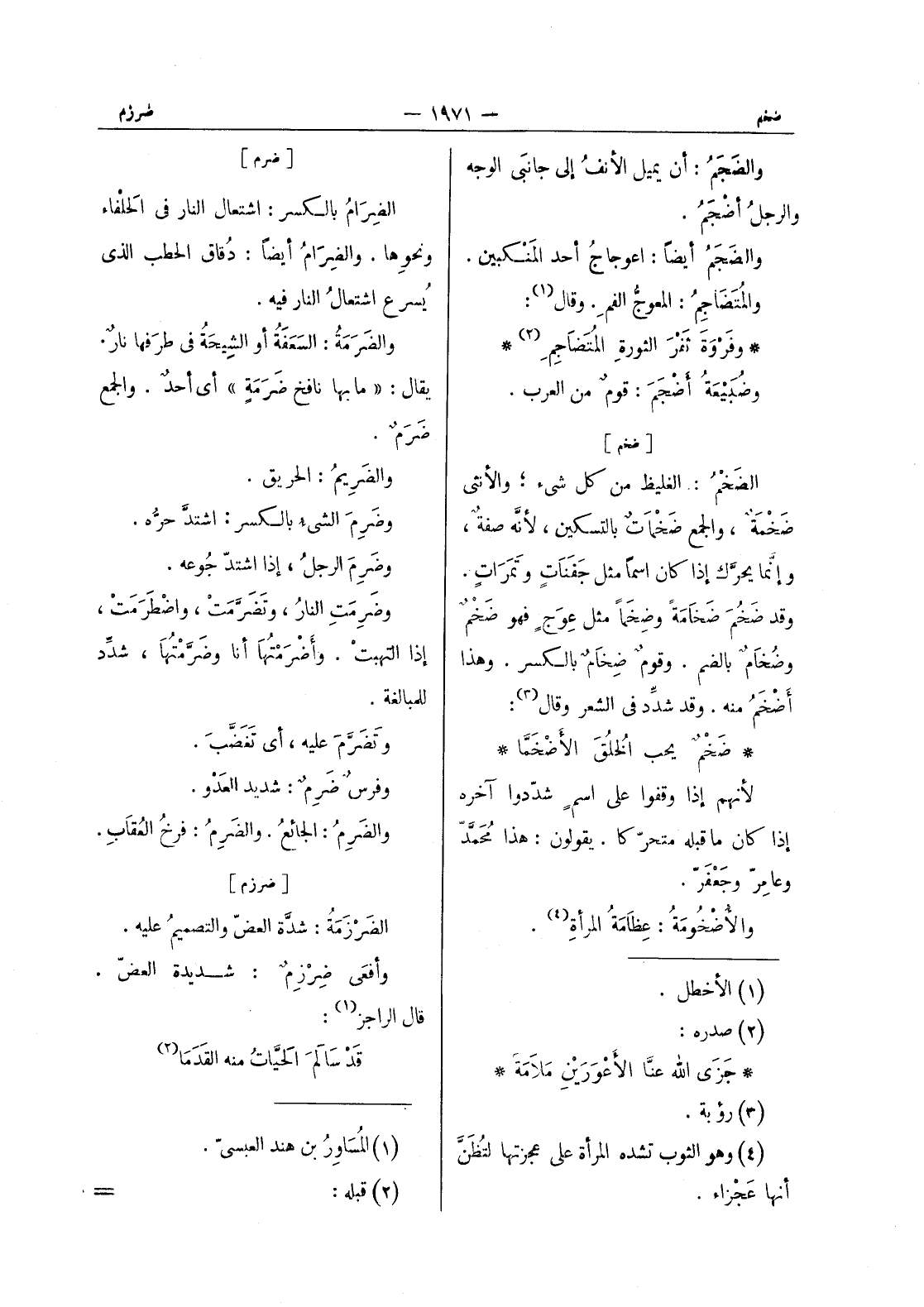 [ضخم] الضَخْمُ: الغليظ من كل شئ، والانثى ضخمة، والجمع ضخمات بالتسكين، لانه صفة، وإنما يحرك إذا كان اسما مثل جفنات وتمرات. وقد ضخم ضخامة وضخما مثل عوج فهو ضَخْمٌ وضُخامٌ بالضم. وقومٌ ضِخامٌ بالكسر. وهذا أضْخَمَ منه. وقد شدد في الشعر وقال (¬3) :