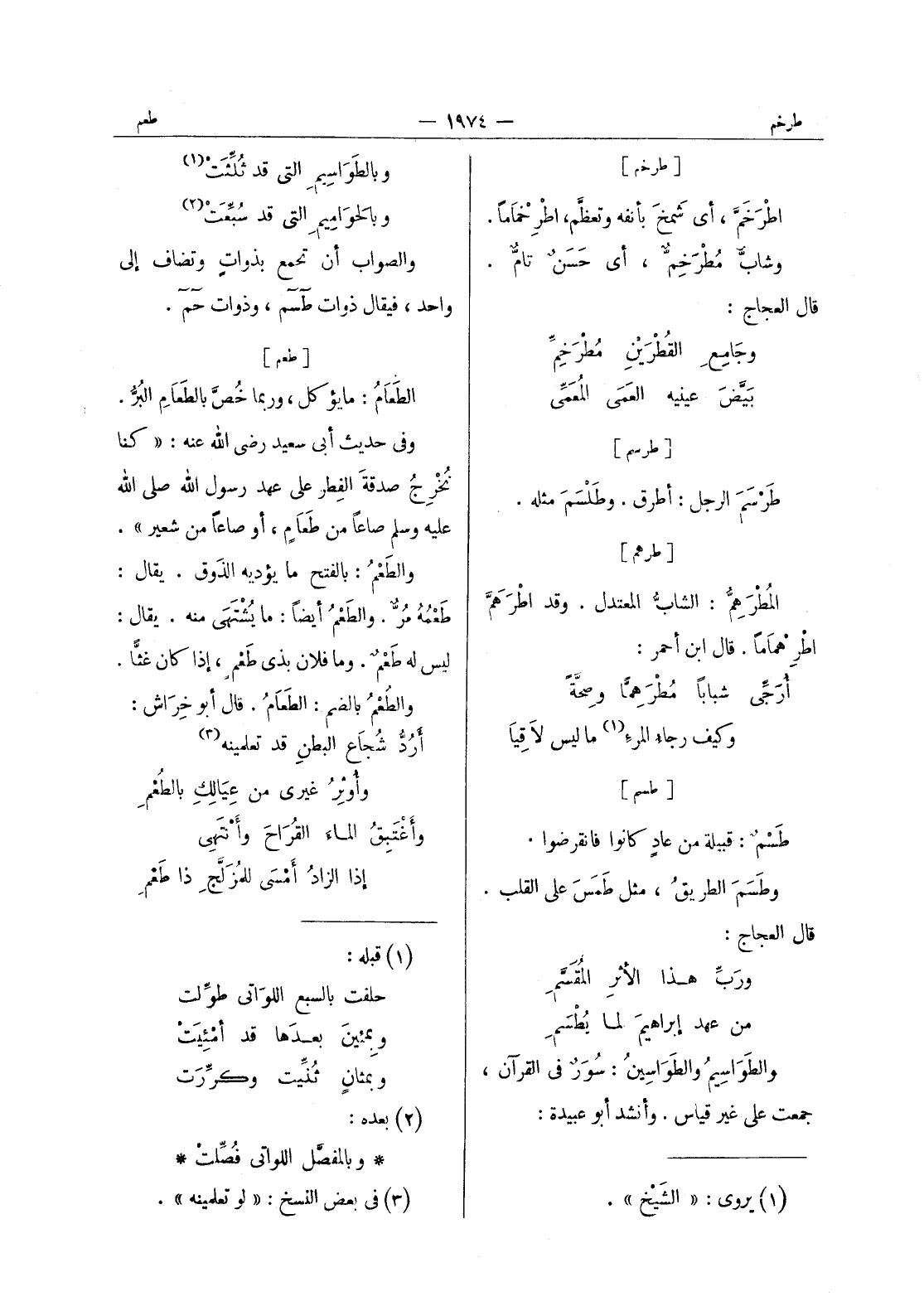[طسم] طسم: قبيلة من عاد كانوا فانقرضوا. وطسم الطريق، مثل طمس على القلب. قال العجّاج: ورَبِّ هذا الأثرِ المُقَسَّمِ من عهد إبراهيمَ لما يُطْسَمِ والطَواسيمُ والطَواسينُ: سُوَرٌ في القرآن، جمعت على غير قياس. وأنشد أبو عبيدة