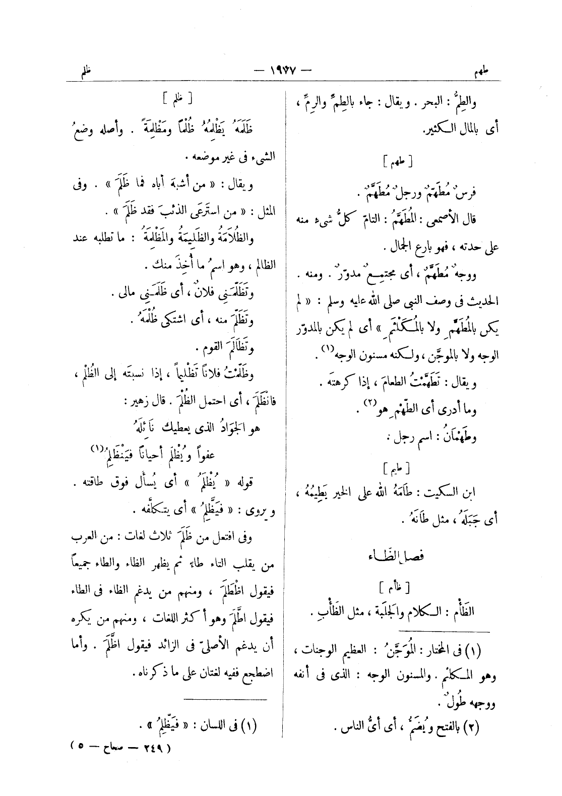 [ظلم] ظَلَمَهُ يَظْلِمُهُ ظُلْماً ومَظْلِمَةً. وأصله وضع الشئ في غير موضعه. ويقال: " من أشبهَ أباه فما ظَلَمَ ". وفي المثل: " من استَرعى الذئبَ فقد ظَلَمَ ". والظُلامَةُ والظَليمَةُ والمَظْلِمَةُ: ما تطلبه عند الظالم، وهو اسمُ ما أُخِذَ منك. وتَظَلَّمَني فلان، أي ظَلَمَني مالي. وتَظَلَّمَ منه، أي اشتكى ظُلْمَهُ. وتَظالَمَ القوم. وظَلَّمْتُ فلاناً تَظْليماً، إذا نسبتَه إلى الظُلْمِ، فانْظَلَمَ، أي احتمل الظُلْمَ. قال زهير: هو الجوادُ الذي يعطيك نائِلَهُ عفواً ويُظْلَم أحياناً فَيَنْظَلِمُ (¬1) قوله " يُظْلَمُ " أي يُسأل فوق طاقته. ويروى: " فيَظَّلِمُ " أي يتكلَّفه. وفي افتعل من ظلم ثلاث لغات: من العرب من يقلب التاء طاء ثم يظهر الظاء والطاء جميعا فيقول اضطلم، ومنهم من يدغم الظاء في الطاء فيقول اطلم وهو أكثر اللغات، ومنهم من يكره أن يدغم الاصلى في الزائد فيقول اظلم. وأما اضطجع ففيه لغتان على ما ذكرناه.
