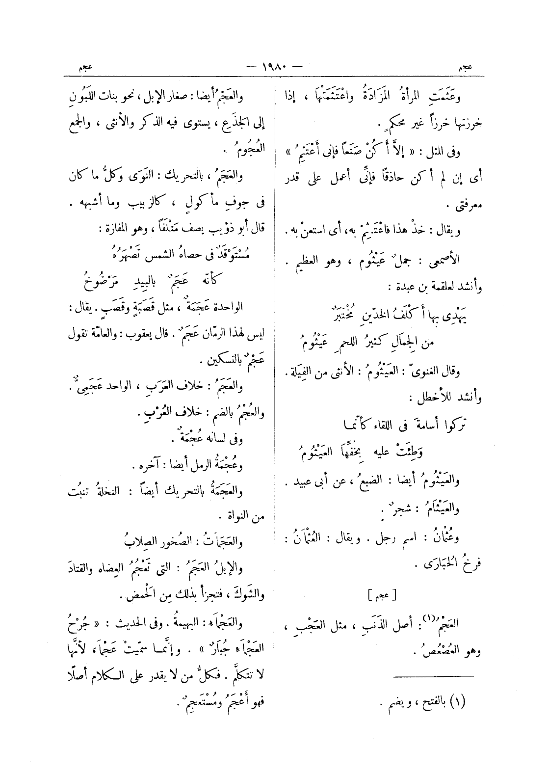 والعجم أيضا: صغار الإبل، نحو بنات اللَبونِ إلى الجَذَعِ، يستوي فيه الذكر والأنثى، والجمع العُجومُ. والعَجَمُ، بالتحريك: النوى وكلُّ ما كانَ في جوفِ مأكولٍ، كالزبيب وما أشبهه. قال أبو ذؤيب يصف مَتْلَفاً، وهو المفازة. مُسْتَوْقَدٌ في حصاهُ الشمس تَصْهَرُهُ كأنّه عَجَمٌ بالبيدِ مرضوخ الواحدة عجمة، مثل قصبة وقصب. يقال: ليس لهذا الرمان عجم. قال يعقوب: والعامة تقول عجم بالتسكين. والعجم: خلاف العَرَبِ، الواحد عَجَمِيٌّ. والعُجْمُ بالضم: خلاف العُرْبِ. وفي لسانه عُجْمَةٌ. وعُجْمَةُ الرمل أيضاً: آخره. والعَجَمَةُ بالتحريك أيضاً: النخلةُ تنبُت من النواة. والعَجَماتُ: الصُخور الصِلابُ والإبلُ العَجَمُ: التي تَعْجُمُ العِضاه والقتادَ والشَوكَ، فتجزأ بذلك من الحَمْض. والعَجْماءُ: البهيمةُ. وفي الحديث: " جُرحُ العَجْماءِ جُبارٌ ". وإنَّما سمّيت عَجْماءَ لأنَّها لا تتكلَّم. فكلُّ من لا يقدر على الكلام أصلاً فهو أعجم ومستعجم.