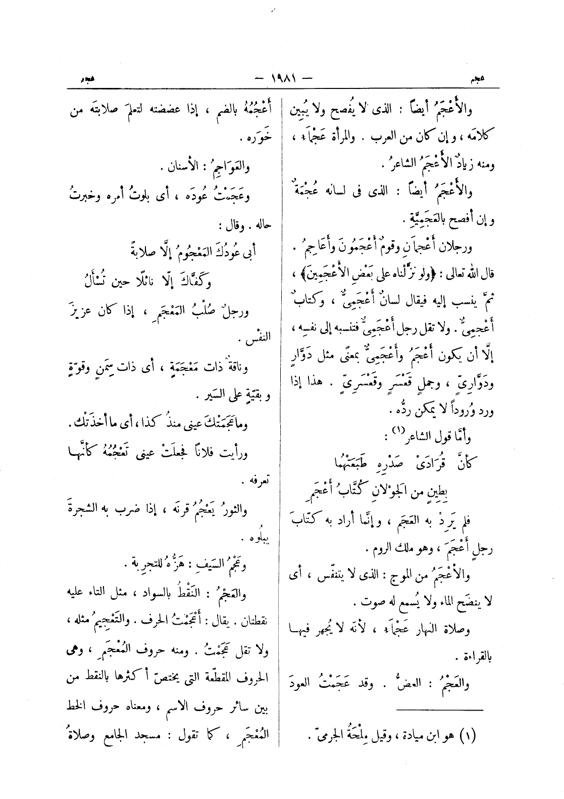 (*) أعجمه بالضم، إذا عضضته لتعلمَ صلابتَه من خَوَره. والعَواجِمُ: الأسنان. وعَجَمْتُ عودَه، أي بلوتُ أمره وخبرتُ حاله. وقال: أبى عودُكَ المَعْجومُ إلاَّ صلابةً وكَفَّاكَ إلا نائلاً حين تُسْألُ ورجلٌ صُلْبُ المَعْجَمِ، إذا كانَ عزيز النفس. وناقةٌ ذات مَعْجَمَةٍ، أي ذات سِمَنٍ وقوّةِ وبقيّةٍ على السَير. وما عجمتك عينى منذا كذا، أي ما أخذَتْك. ورأيت فلاناً فجعلَتْ عيني تَعْجُمُهُ كأنَّها تعرفه. والثورُ يَعْجُمُ قرنَه، إذا ضرب به الشجرةَ يبلُوه. وعَجْمُ السيفِ: هَزُّهُ للتجرِبة. والعَجْمُ: النَقْطُ بالسواد، مثل التاء عليه نقطتان. يقال: أعجمت الحرف. والتَعْجيمُ مثله، ولا تقل عجمت. ومنه حروف المعجم، وهى الحروف المقطعة التى يختص أكثرها بالنقط من بين سائر حروف الاسم، ومعناه حروف الخط المعجم، كما تقول: مسجد الجامع وصلاة