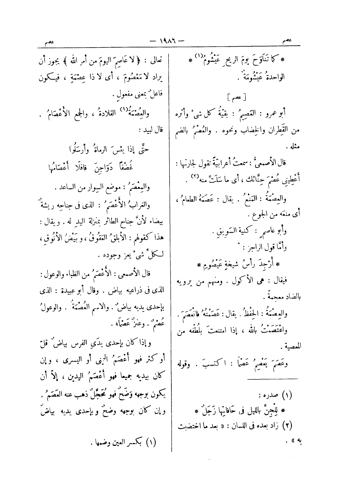 أُرْجِدَ رأسُ شيخةٍ عَيْصومِ * فيقال: هي الاكول. ومنهم من يرويه بالضاد معجمة. والعصمة: الحفظ. يقال: عَصَمْتُهُ فانْعَصَمَ. واعْتَصَمْتُ بالله، إذا امتنعتَ بلُطْفه من المعصية. وعَصَمَ يَعْصِمُ عَصْماً: اكتسبَ. وقوله