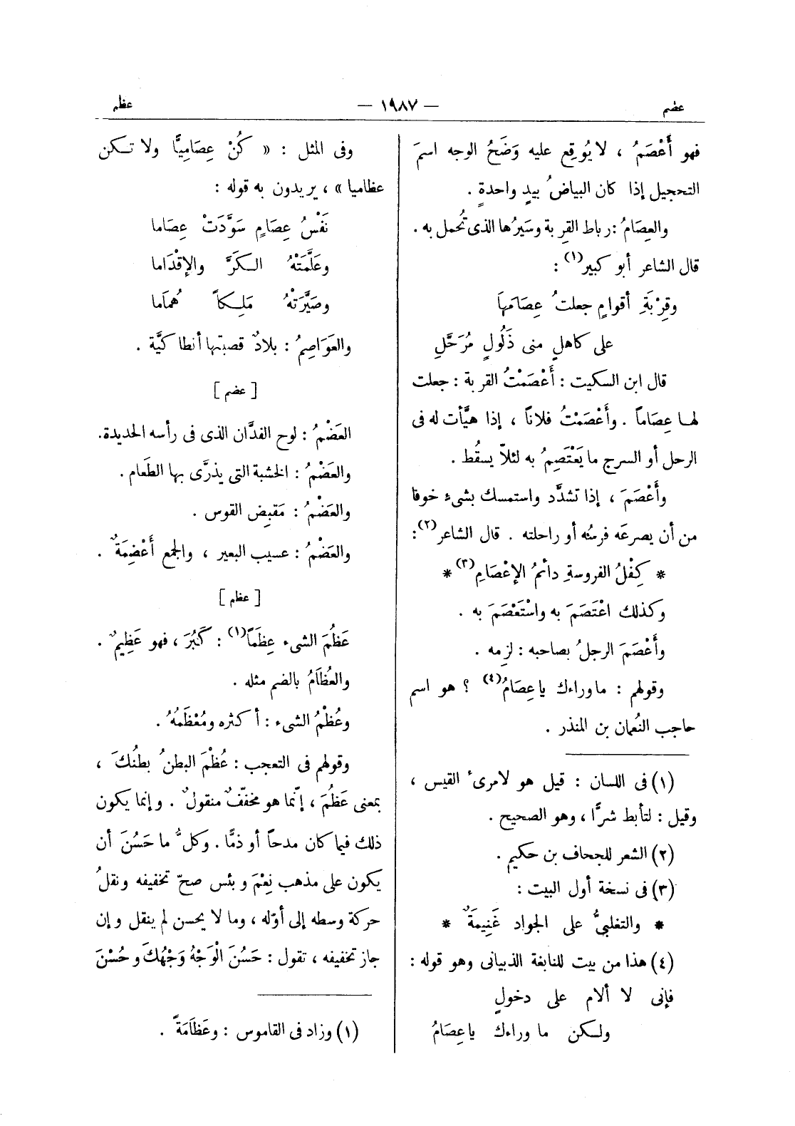وفي المثل: " كُنْ عِصامِيًّا ولا تكن عظامياً "، يريدون به قوله: نَفْسُ عِصامٍ سَوَّدَتْ عِصاما وعَلَّمَتْهُ الكَرَّ والإقْداما وصَيَّرَتْهُ مَلِكاً هُماما والعواصم: بلاد قصبتها أنطاكيه.