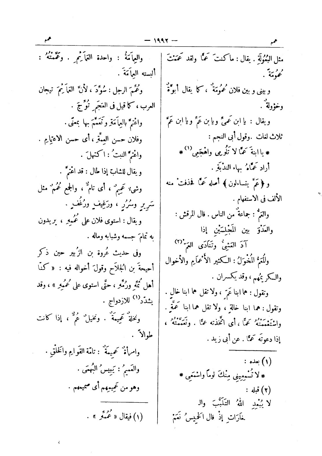 يا ابنة عَمَّا لا تَلومي واهْجَعي (¬1) * أراد عَمَّاهُ بهاء الندبة. و (عم يتساءلون) أصله عمَّا فحذفت منه الألف في الاستفهام. والعَمُّ: جماعةٌ من الناس. قال المرقش: والعَدْوَ بين المجلِسَيْنِ إذا آدَ العَشِيُّ وتَنادى العَمّ (¬2) والمعم المخول: الكثير الاعمام والأخوال والكريمهم، وقد يكسران. وتقول: هما ابنا عَمٍّ، ولا تقل هما ابنا خالٍ. وتقول: هما ابنا خالةٍ، ولا تقل هما ابنا عَمَّةٍ. واسْتَعْمَمْتُهُ عَمًّا، أي اتَّخذته عمًّا. وتَعَمَّمْتُهُ، إذا دعوته عما. عن أبى زيد.
