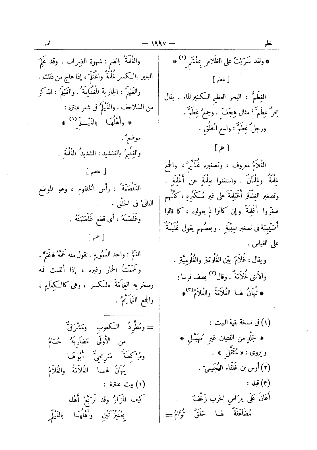[غلم] الغُلامُ معروف، وتصغيره غُلَيِّمٌ، والجمع غِلْمَةٌ وغِلْمانٌ. واستغنوا بغِلمَةٍ عن أغْلِمَةٍ. وتصغير الغِلْمَةِ أُغَيْلِمَةٌ على غير مكبره، كأنهم صغروا أغلمة وإن كانوا لم يقولوه، كما قالوا أصيبية في تصغير صبية. وبعضهم يقول غليمة على القياس. ويقال: غلام بيِّن الغُلومَةِ والغُلومِيَّةِ. والأنثى غُلامَةٌ. وقال (¬2) يصف فرسا: