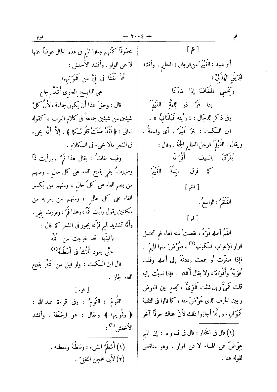 [فم] الفم أصله فوه، نقصت منه الهاء فلم تحتمل الواو الاعراب لسكونها (¬1) ، فعوض منها الميم. فإذا صغَّرت أو جمعت رددته إلى أصله وقلت فُوَيْهٌ وأفْواهٌ، ولا يقال أفْماءٌ. فإذا نسبت إليه قلت فَميٌّ وإن شئت فموى، تجمع بين العوض وبين الحرف الذي عوِّض منه، كما قالوا في التثنية فَمَوانِ. وإنما أجازوا ذلك لان هناك حرفا آخر