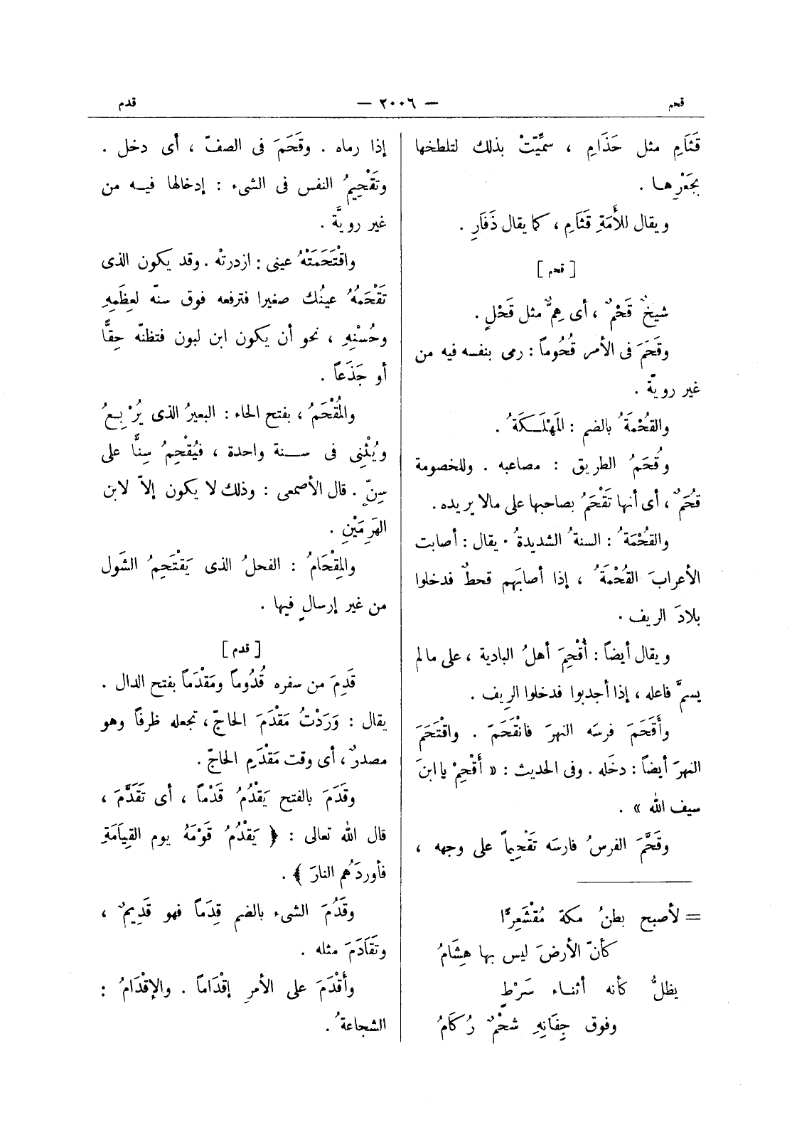 (*) إذا رماه. وقَحَمَ في الصفّ، أي دخل. وتَقْحيمُ النفس في الشئ: إدخالها فيه من غير رويَّة. واقْتَحَمَتْهُ عيني: ازدرتْه. وقد يكون الذي تَقْحَمُهُ عينك صغيراً فترفعه فوق سنّه لعِظمه وحُسنه، نحو أن يكون ابن لبون فتظنّه حِقًّا أو جَذَعاً. والمُقْحَمُ، بفتح الحاء: البعير الذي يربِعُ ويُثني في سنة واحدة، فيُقْحِمُ سنا على سن. قال الاصمعي: وذلك لا يكون إلا لابن الهرمين. والمقحام: الفحل الذي يَقْتَحِمُ الشَول من غير إرسال فيها.