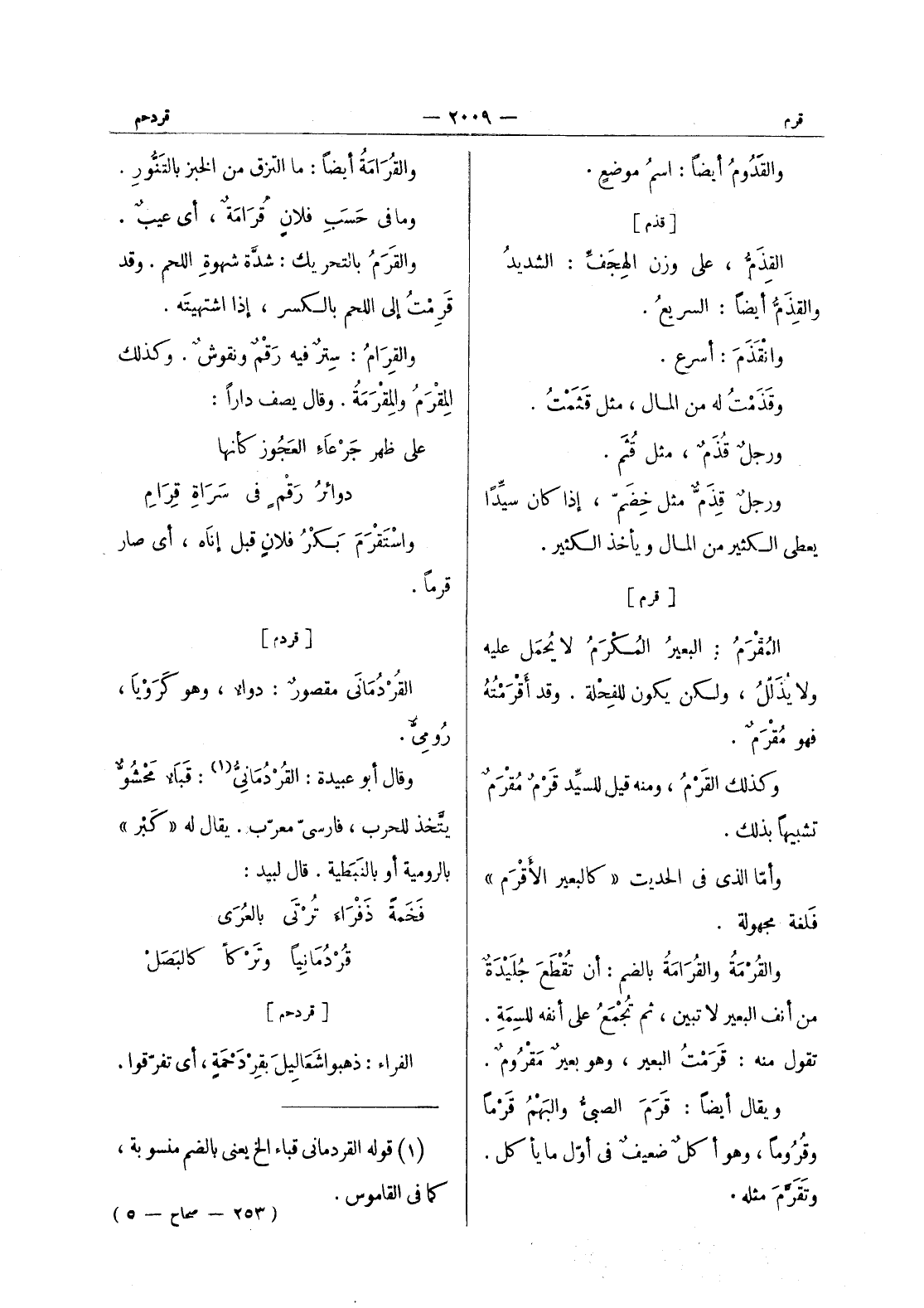 [قردم] القُرْدُمانى مقصورٌ: دواءٌ، وهو كَرَوْيا، رومِيّ. وقال أبو عبيدة: القُرْدُمانِيُّ (¬1) : قَباءٌ مَحْشُوٌّ يتَّخذ للحرب، فارسيّ معرَّب. يقال له " كَبْر " بالرومية أو بالنبطية. قال لبيد: فخمة ذفراء ترتى بالعرى قردمانيا وتركا كالبصل