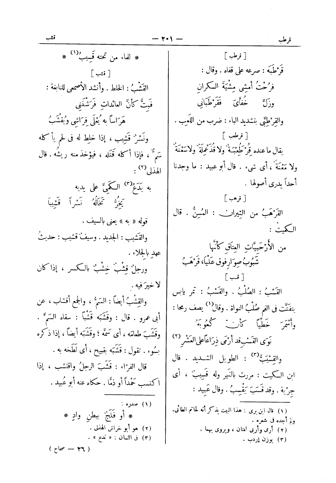 [قشب] القَشْبُ: الخلط. وأنشد الأصمعيّ للنابغة: فَبِتُّ كأنَّ العائداتِ فَرَشْنَني * هَراساً به يُعْلى فِراشي ويُقْشَبُ ونَسرٌ قَشيبٌ، إذا خلِط له في لحم يأكله سَمٌّ، فإذا أكله قَتَله، فيؤخذ منه ريشه. قال الهذلى (¬2) : به يدع (¬3) الكمى على يديه * يخر تخاله نسرا قشيبا قوله " به " يعنى بالسيف. والقَشيب: الجديد. وسيفٌ قشيب: حديثُ عهدٍ بالجِلاءِ. ورجلٌ قِشْبٌ خِشْبٌ بالكسر، إذا كان لا خير فيه. والقِشْبُ أيضاً: السَمُّ، والجمع أقشاب، عن أبي عمرو، قال: وقَشَبَهُ قِشْباً: سقاه السَمَّ. وقَشَبَ طعامَه، أي سَمَّه، وقَشَبَه أيضاً، إذا ذكره بسوء. تقول: قَشَبَهُ بقبيح، أي لَطَخه به. قال الفرّاء: قَشَبَ الرجلُ واقتشب، إذا اكتسب حمدا أو ذما. حكاه عنه أبو عبيد.