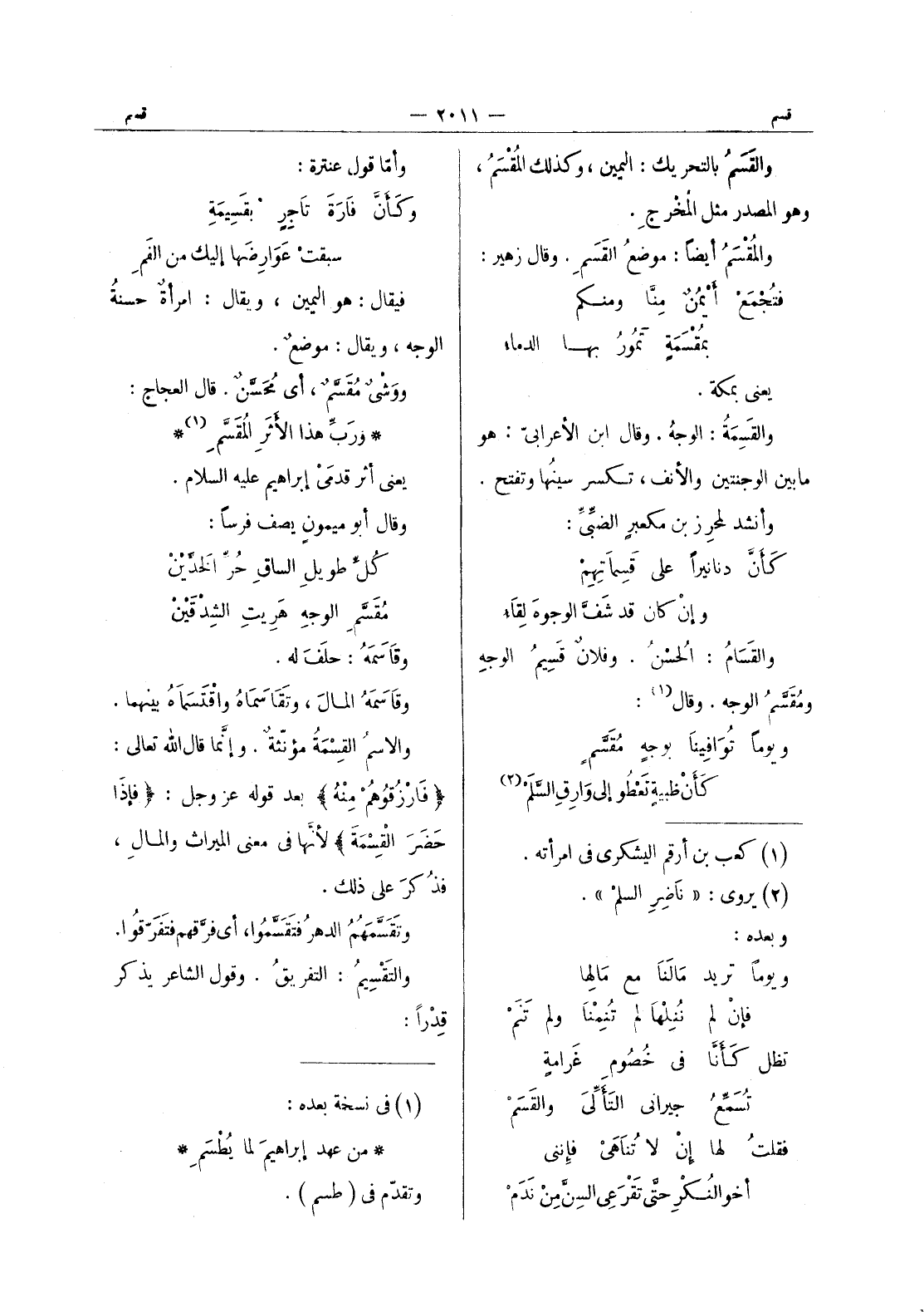 والقسم بالتحريك: اليمين، وكذلك المقسم، وهو الصمدر مثل المخرج. والمقسم أيضا: موضعُ القَسَمِ. وقال زهير: فتُجْمَعُ أيْمُنٌ مِنَّا ومنكم بمُقْسَمَةٍ تَمورُ بها الدماء يعني بمكة. والقَسِمَةُ: الوجهُ. وقال ابن الأعرابي: هو ما بين الوجنتين والأنف، تكسر سينُها وتفتح. وأنشد لمحرز بن مكعبرٍ الضبِّي: كَأنَّ دنانيراً على قَسِماتِهِم وإن كان قد شَفَّ الوجوهَ لِقاءُ والقَسامُ: الحسنُ. وفلانٌ قسيم الوجه ومقسم الوجه. وقال (¬1) : ويوما توافينا بوجه مقسم كأن ظبية تعطو إلى وارق السلم (¬2)