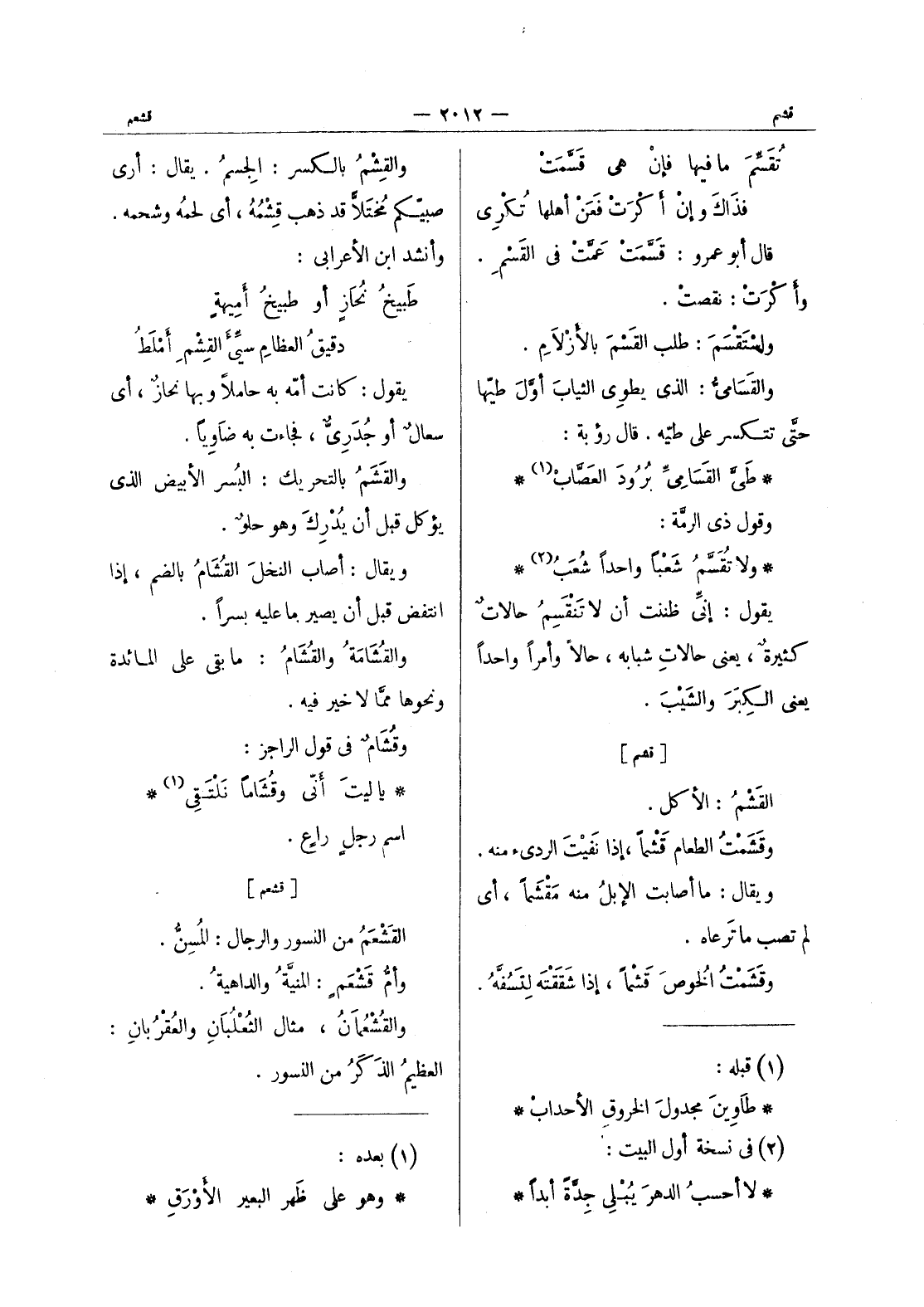 تقسم ما فيها فإن هي قسمت فذاك وإن أكرت فعن أهلها تكرى قال أبو عمرو: قسمت عمت في القسم. وأكرت: نقصت. واستقسم: طلب القسم بالازلام. والقسامى: الذى يطوى الثياب أول طيها حتى تتكسر على طيه. قال رؤية. * طى القسامى برود العصاب (¬1) * وقول ذى الرمة: