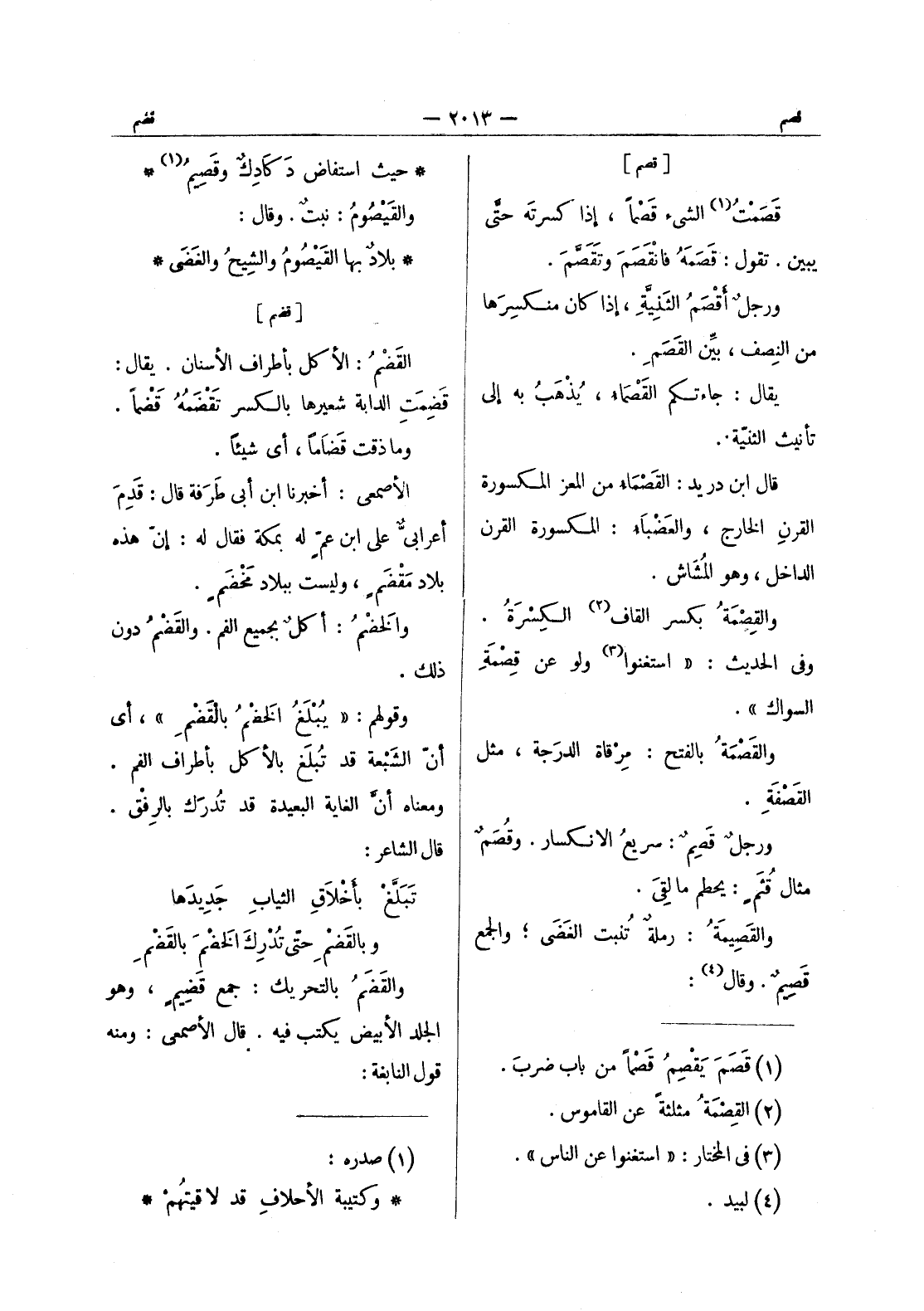 [قصم] قصمت (¬1) الشئ قصما، إذا كسرتَه حتَّى يبين. تقول: قَصَمَهُ فانْقَصَمَ وتَقَصَّمَ. ورجلٌ أقْصَمُ الثَنيَّةِ، إذا كان منكسِرها من النصف، بيِّن القَصَمِ. يقال: جاءتكم القَصْماءُ، يُذْهَب به إلى تأنيث الثنية. قال ابن دريد: القَصْماءُ من المعز المكسورة القرنِ الخارج، والعَضْباءُ: المكسورة القرن الداخل، وهو المُشاش. والقصمة بكسر القاف (¬2) الكسرة. وفي الحديث: " استغنوا (¬3) ولو عن قصمة السواك ". والقصمة بالفتح: مرقاة الدرجة، مثل القصفة. ورجل قصم: سريعُ الانكسار. وقُصَمٌ مثال قثمٍ: يحطم ما لَقي. والقَصيمَةُ: رملةٌ تنبت الغضى، والجمع قصيم. وقال (¬4)
