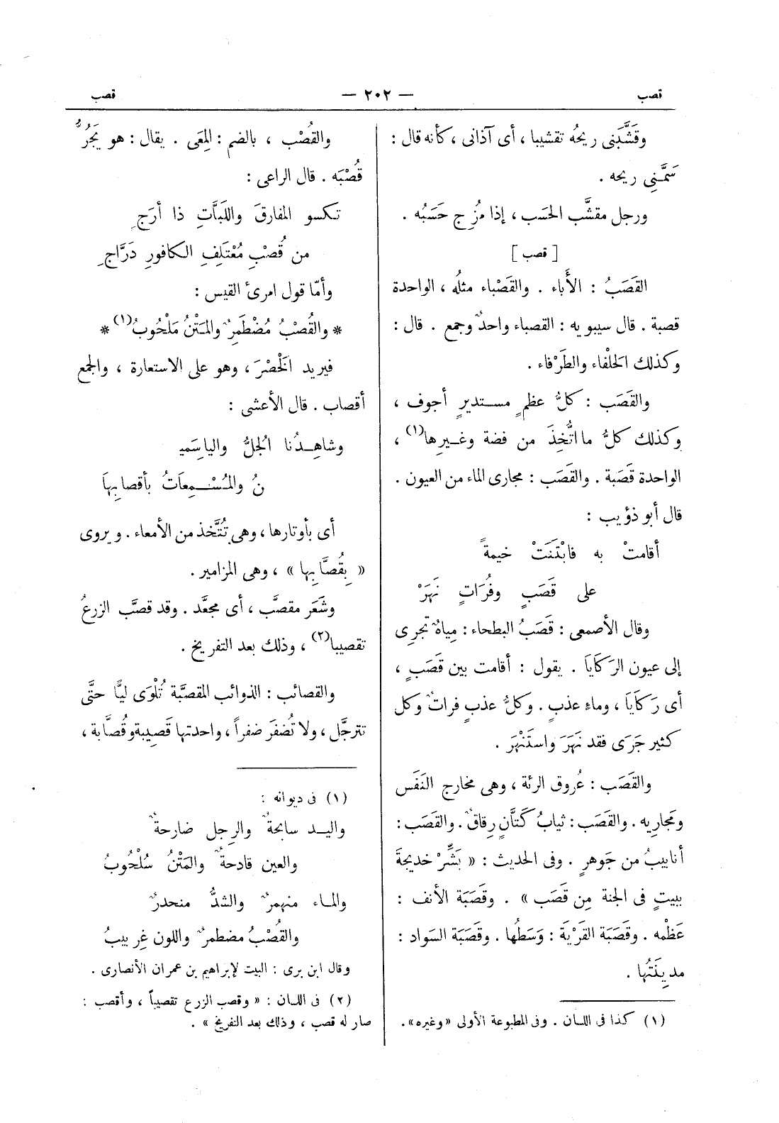[قصب] القَصَبُ: الأباء. والقَصْباء مثله، الواحدة قصبة. قال سيبويه: القصباء واحدٌ وجمع. قال: وكذلك الحلفاء والطَرفاء. والقَصَب: كلُّ عظمٍ مستديرٍ أجوف، وكذلك كلُّ ما اتُّخذَ من فضَّة وغيرها (¬1) ، الواحدة قَصَبة. والقَصَب: مجاري الماء من العيون. قال أبو ذؤيب: أقامتْ به فابْتَنَتْ خيمةً * على قَصَبٍ وفراتٍ نَهَرْ وقال الأصمعيّ: قَصَبُ البطحاء: مياهٌ تجري إلى عيون الرَكايا. يقول: أقامت بين قَصَبٍ، أي ركايا، وماء عذب. وكل عذب فرات وكل كثير جرى فقد نهر واستنهر. والقصب: عروق الرئة، وهي مخارج النَفَس ومجاريه. والقَصَب: ثيابُ كتَّانٍ رِقاقٌ. والقَصَب: أنابيبُ من جوهرٍ. وفي الحديث: " بَشِّرْ خديجةَ ببيتٍ في الجنَّة من قَصَب ". وقَصَبَةُ الأنف: عظمه. وقَصَبَةُ القَريةَ: وسطها. وقَصَبَةُ السَواد: مدينتها.