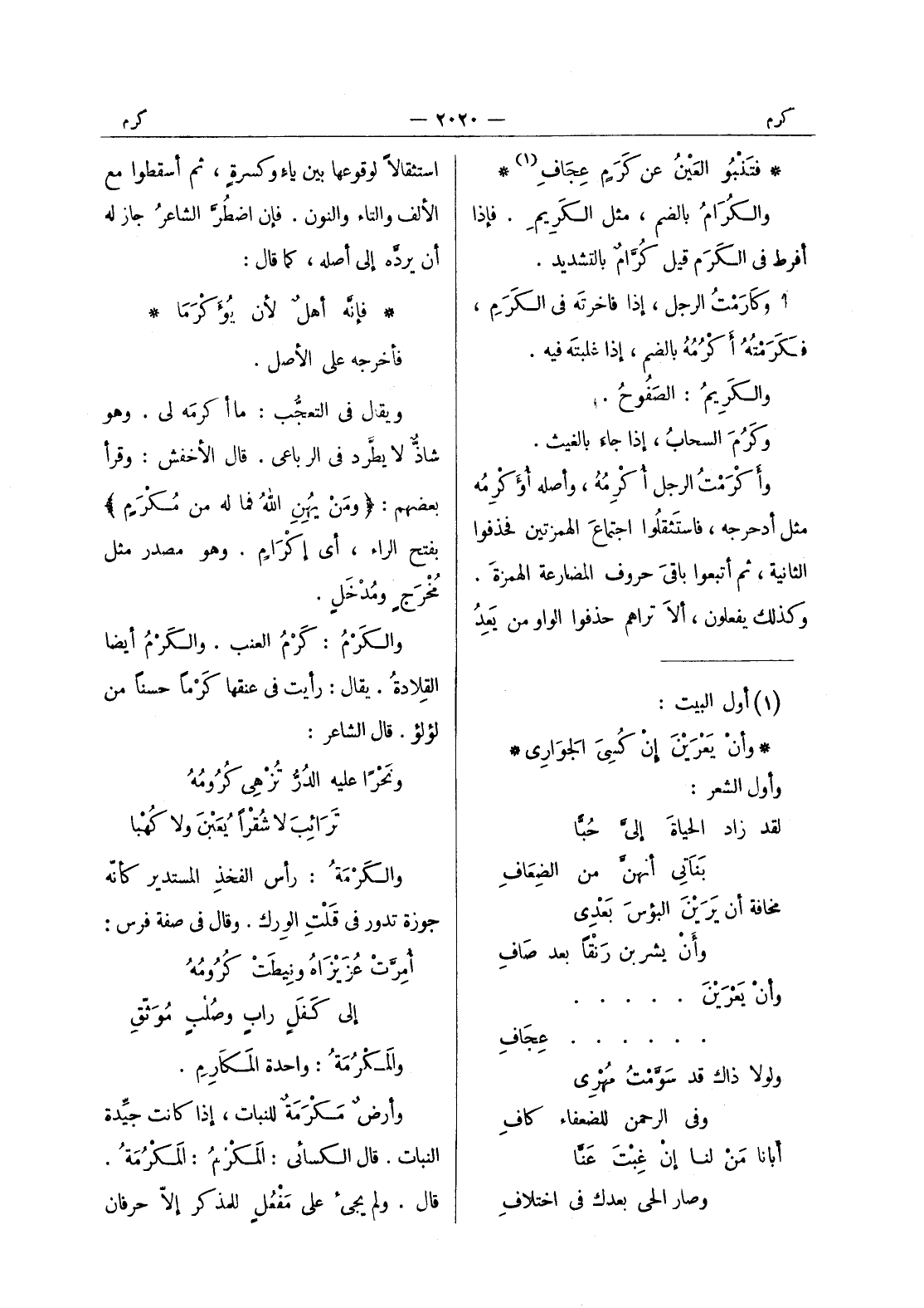 * فتنبو العين عن كرم عجاف (¬1) * والكرام بالضم، مثل الكَريمِ. فإذا أفرط في الكَرَم قيل كُرَّامٌ بالتشديد. وكارَمْتُ الرجل، إذا فاخرتَه في الكَرَمِ، فكَرَمْتُهُ أكْرُمُهُ بالضم، إذا غلبتَه فيه. والكَريمُ: الصَفوحُ. وكَرُمَ السحابُ، إذا جاء بالغيث. وأكْرَمْتُ الرجل أكرمه، وأصله أؤكرمه مثل أدحرجه، فاستثقلوا اجتماع الهمزتين فحذفوا الثانية، ثم أتبعوا باقى حروف المضارعة الهمزة. وكذلك يفعلون، ألا تراهم حذفوا الواو من يعد