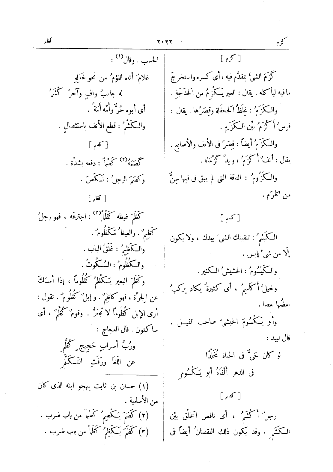 الحسب. وقال (¬1) : غلام أتاه اللؤم من نحو خاله له جانب واف وآخركشم أي أبوه حر وأمه أمة. والكشم: قطع الانف باستئصال.